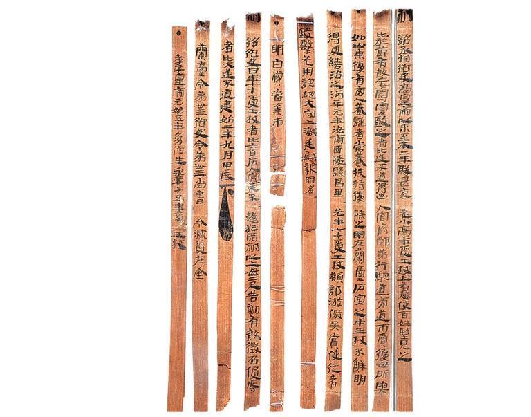 王杖簡,漢代,出土于武威市磨咀子漢墓。共計10枚,松木削制。兩道編繩,先書后編;墨書隸體,字跡清晰。每枚簡容字多者37字,少者6字,共240字。其內(nèi)容記載了東漢永平十五年(72年)幼伯受王杖事,并錄建始二年(前31年)九月“年七十受王杖”的詔書與河平元年(前28年)毆擊王杖主當棄市的令。