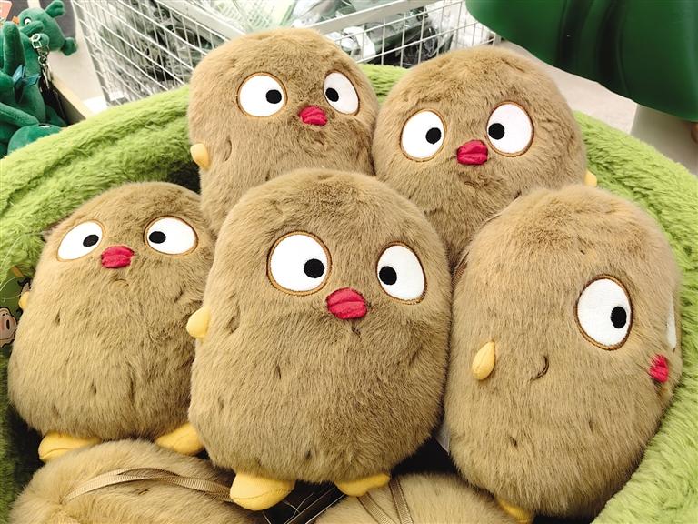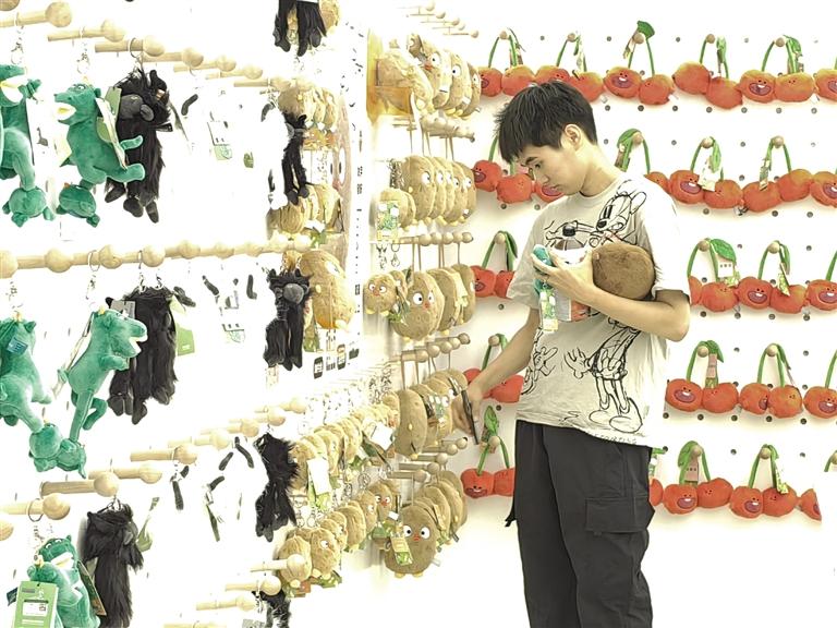 此時,目不暇接的花式文創(chuàng)在店內(nèi)“爭奇斗艷”,爭當“顯眼包”,等待被主人帶回家。掀開店內(nèi)一只毛絨收納箱,一窩土豆子撲閃著大眼睛向你眨眼。都說轉(zhuǎn)角遇到愛,誰料,轉(zhuǎn)角處粉嘟嘟的“拿捏玩偶娃娃公仔”捏著一個小蓮花花苞在向你招手。一回頭,造型別致的文創(chuàng)飾品精美又時尚,一側(cè)的帆布包上印著“別卷我”。就連記者逛下來,都入手兩件文創(chuàng)。