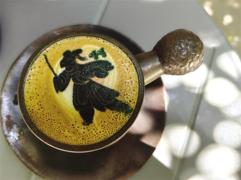 驚喜還有很多,就像店內(nèi)柜體上的一句話“可以讓大家體會到我們不一樣的用心”,這些年輕人用心起來還真能撬動地球。飲品和咖啡,設(shè)計團隊愣是把口味和地域文化結(jié)合起來,整出了幾款“限量版”:城市限定——沙橙暴飲品,西北特有;特調(diào)咖啡——苦水玫瑰特調(diào),讓人一口難忘之余還配上了臺詞,“苦水玫瑰有點甜”;“文物咖啡”更是占據(jù)“C位”,咖啡拉花機“印制”而成的微縮版銅奔馬、蛙紋罐、銅車馬等文物圖案浮在濃郁的咖啡上,精致、唯美。這還不算,咖啡器皿的名稱也非同尋常——鷹首權(quán)杖杯。陶瓷來自景德鎮(zhèn),手柄是省博鷹頭形青銅權(quán)杖首的文物原型。驚嘆、贊美、感慨,每一位品嘗之人喜愛之余竟不忍飲用。