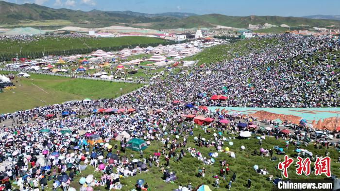 8月4日,民眾在當(dāng)周草原浪山聚會(huì)。當(dāng)日,第22屆九色甘南香巴拉旅游藝術(shù)節(jié)在甘肅省甘南藏族自治州當(dāng)周草原開幕。人們身著節(jié)日盛裝載歌載舞、歡聚一堂,馬隊(duì)巡游、千人鍋莊舞等活動(dòng)精彩上演。九色甘南香巴拉旅游藝術(shù)節(jié)既是民眾浪山聚會(huì)的節(jié)日盛會(huì),也是展現(xiàn)發(fā)展成就、擴(kuò)大對(duì)外開放的重要窗口,更是展示民俗文化、促進(jìn)廣泛交往交流交融的有效載體。(無(wú)人機(jī)照片)中新社記者 九美旦增 攝