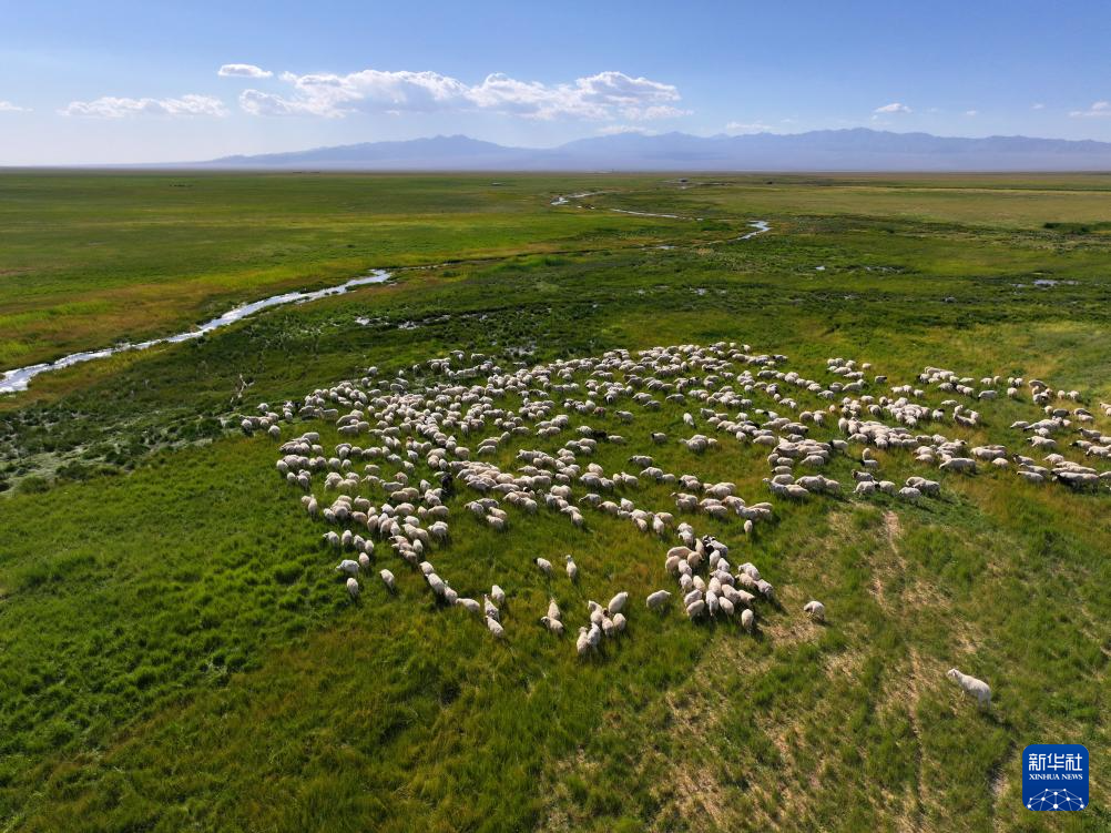 7月30日,羊群在小蘇干湖濕地覓食(無(wú)人機(jī)照片)。新華社發(fā)(高宏善 攝)
