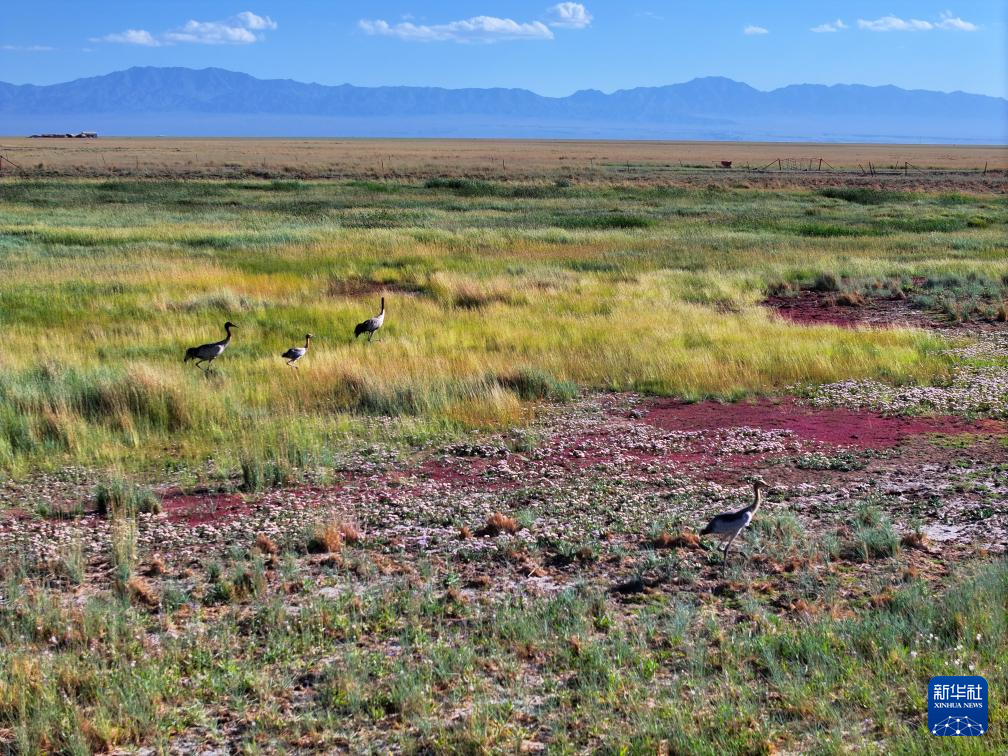 7月30日,黑頸鶴在小蘇干湖濕地覓食(無(wú)人機(jī)照片)。新華社發(fā)(高宏善 攝)