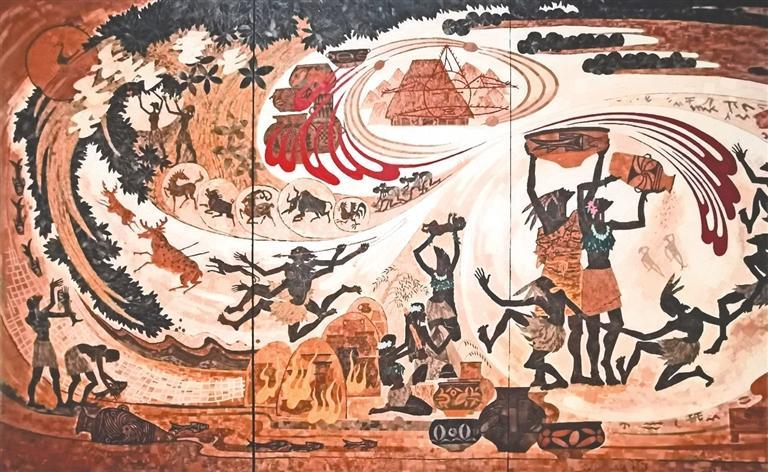 在《中國彩陶》這件作品中,通過對彩陶紋樣的想象,在構(gòu)圖上使用類旋紋的曲線來分割空間,分別表現(xiàn)了祭祀、種植、建筑、制陶、捕魚、狩獵、采集、馴化等情景??紤]到陶片所獨有的啞光質(zhì)感和其悠久的文化底蘊與作品的主題相吻合,故決定使用陶片結(jié)合傳統(tǒng)的大漆工藝進行鑲嵌,使作品在內(nèi)容與形式上達到統(tǒng)一。
