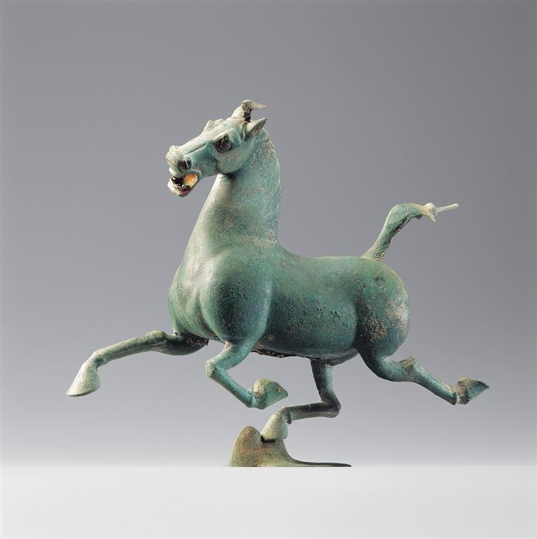 銅奔馬,東漢,1969年武威市雷臺墓出土。馬作奔騰狀,三足騰空,右后蹄踏一展翅飛翔、回首驚顧的飛鳥。奔馬全身著力點集于超掠飛鳥的一足之上,準確地把握了力學平衡。蹄踏飛鳥,表現(xiàn)出馬行迅疾,在鳥驚回首的剎那已經(jīng)超越了飛行的鳥。銅奔馬鑄造精美,構思巧妙,為我國青銅藝術中罕見的杰作,1983年被確定為中國旅游標志,2002年被國家文物局列入首批禁止出國(境)展覽文物目錄。它以卓絕的藝術造詣千古生輝,成為中華民族勇往直前、積極進取偉大氣質的象征。