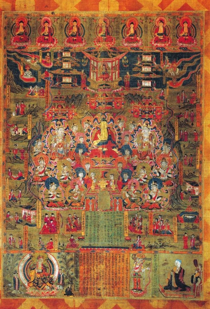 該畫為絹地設色,出自敦煌莫高窟藏經(jīng)洞。畫面中心為說法圖,一佛二菩薩法相莊嚴,諸菩薩、弟子、比丘、比丘尼、優(yōu)婆塞、優(yōu)婆夷等“赴會圣眾”圍繞周圍。兩側及上方分布15幅經(jīng)變故事圖,以連環(huán)畫形式鋪陳展現(xiàn)《佛說父母恩重經(jīng)》的基本內容。其上繪七佛、彌勒與七寶,其下墨書《佛說報父母恩重經(jīng)變》。絹畫最下方自左向右排布地藏菩薩、《繪佛邈真紀》、引路菩薩及比丘尼戒行邈真像。該絹畫保存完整,色彩絢麗,是敦煌《佛說父母恩重經(jīng)》諸變相中,內容最復雜,畫面情節(jié)最多,特點最鮮明,風格最獨特的一幅,且有宋淳化二年(公元991年)明確紀年,具有重要的歷史、藝術和研究價值。