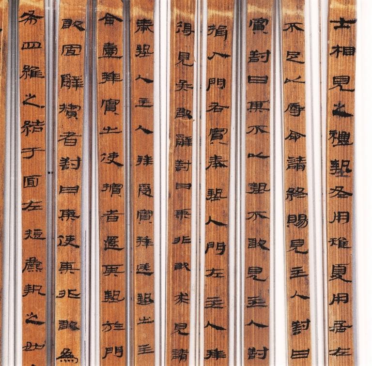 《儀禮》簡,西漢,武威磨嘴子出土。分木質和竹質兩種,共496枚,編為甲、乙、丙三本,系先編后寫。甲本為《儀禮》17篇中的7篇,乙本僅存《服傳》一篇,丙本僅存《喪服》一篇。該簡冊保存基本完好,與傳世的鄭玄注本不同,應是目前所見《儀禮》的最古寫本,在版本??鄙嫌泻芨叩膬r值,且書寫工整秀麗,是漢代墨寫隸書的上品。