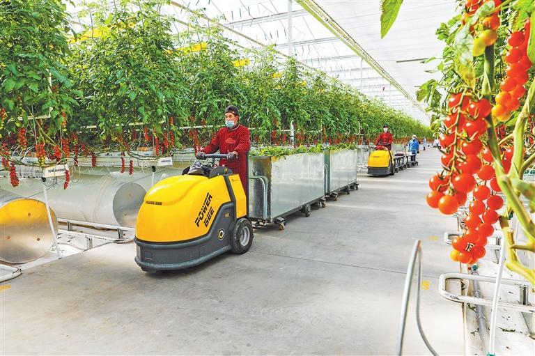 古浪越海農(nóng)業(yè)有限公司智能溫室內(nèi),務(wù)工人員運(yùn)送小番茄。 武威市融媒體中心供圖