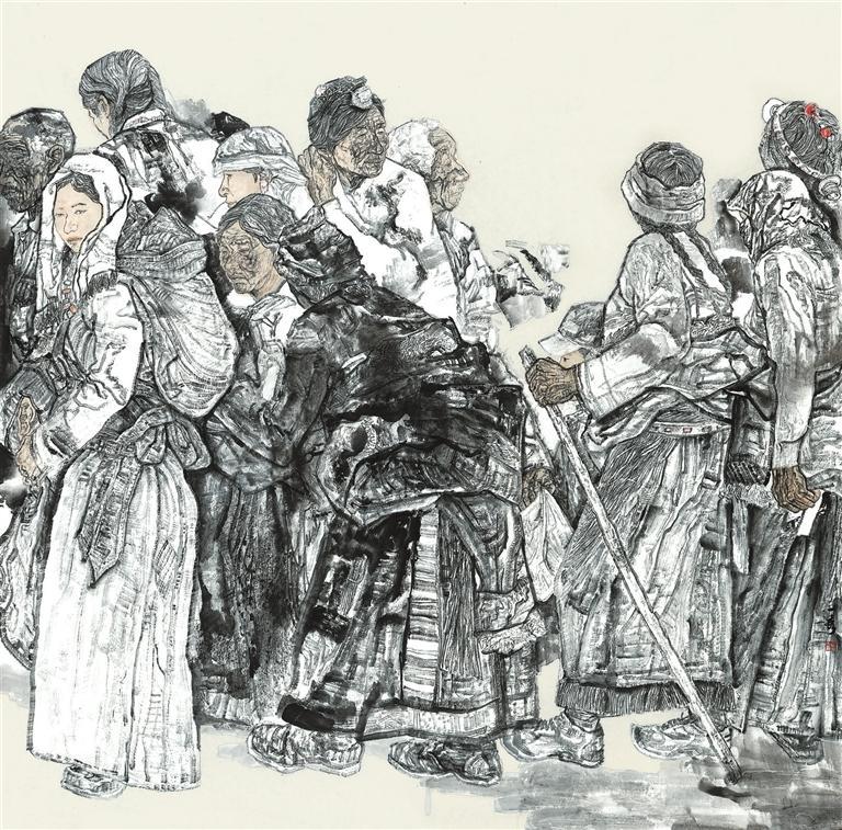 作品《趕集》主要描繪了不同年齡階段的人物聚集一起趕集的一幕,以筆墨求真的態(tài)度,通過不同的形象去表現(xiàn)人物的真善美。在落墨前,我對人物造型和畫面形式結(jié)構(gòu)反復推敲打磨,力求作品更有溫度和厚度。
