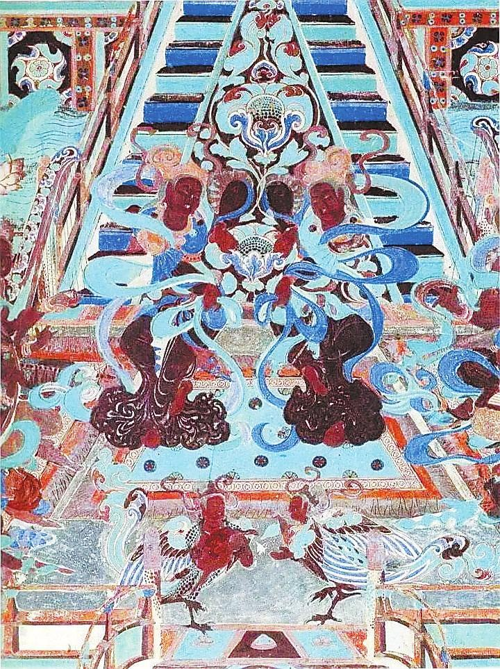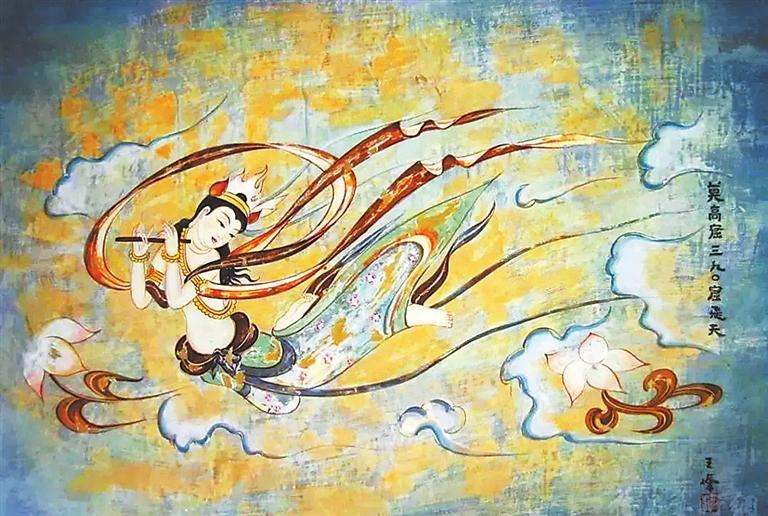 敦煌莫高窟,窟窟有壁畫,拼接起來長達(dá)45000多平方米,有世界上“最大畫廊”之稱。這些壁畫中,幾乎每幅都有舞蹈形象,如在窟頂、龕楣、藻井遨游的飛天,憑欄上的天宮伎樂,經(jīng)變畫中的娛佛、敬佛的獻(xiàn)舞者——伎樂天,出行圖中跳著具有濃郁生活氣息的世俗樂舞,以及富有舞蹈美感的彩塑菩薩、天王力士等,琳瑯滿目,精妙絕倫。這些舞蹈形象充分反映了從十六國北朝至元代千余年來不同歷史時(shí)期的舞蹈服飾、形態(tài)、風(fēng)貌,為我們挖掘、整理、弘揚(yáng)中華民族舞蹈文化提供了十分珍貴的形象資料。