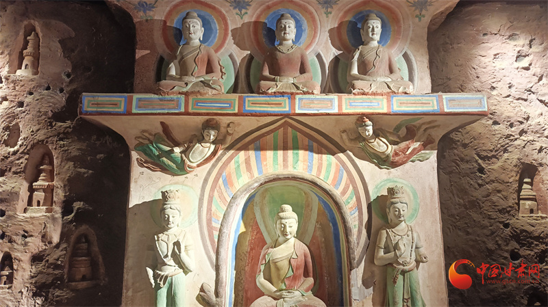 其中千佛洞第6號(hào)窟出現(xiàn)了一組巨大的一佛二弟子石雕立像,這三尊雕像保存得非常完整,連鑿刻痕跡都宛然如新,而且沒(méi)有一點(diǎn)缺損。