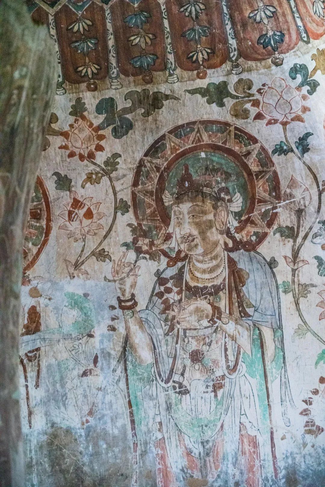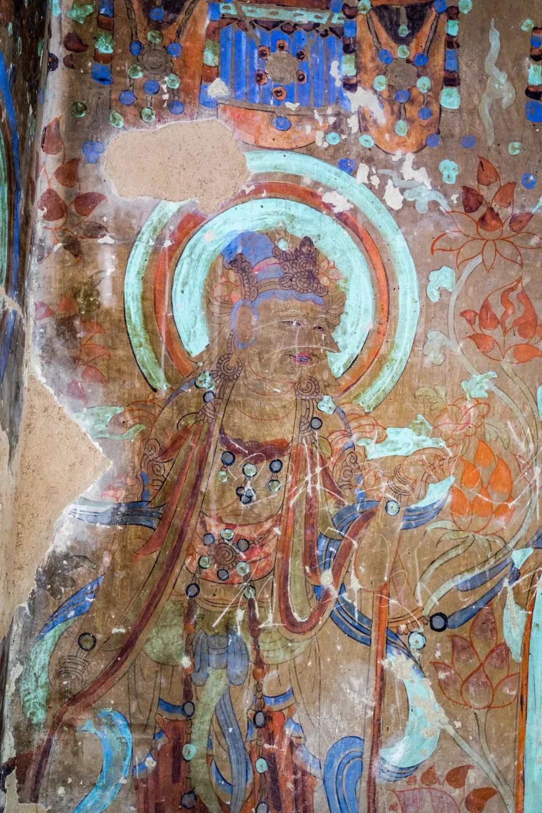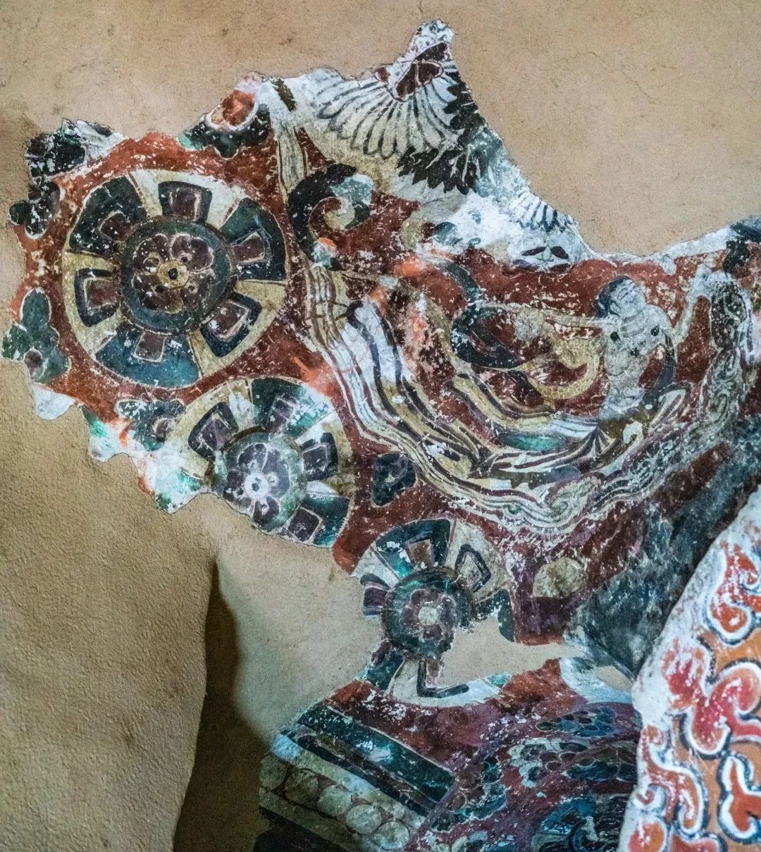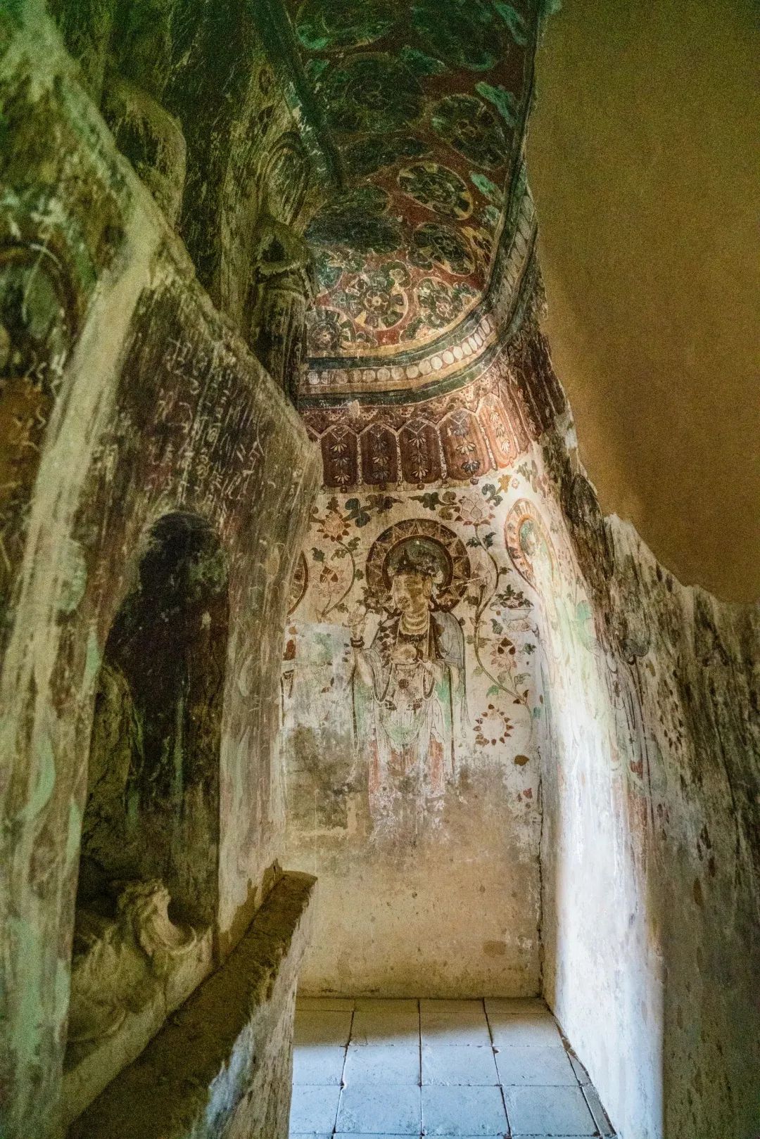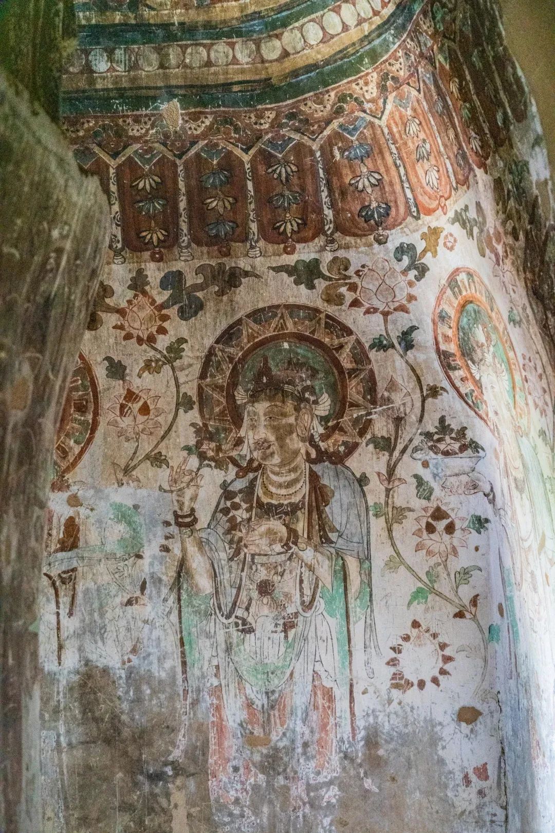 昌馬石窟第4窟洞窟形制及其殘存的塑像對于研究中國早期石窟藝術(shù)與佛教造像藝術(shù)極其重要??邇?nèi)壁畫內(nèi)容是四壁上方畫條式旌幡,下畫供養(yǎng)菩薩,身高近2米,今殘存20身,菩薩周圍畫纏枝蓮,與第二窟基本相同??唔斍鞍氩康卣檀蟛糠置撀?,靠近中心柱正面上部右側(cè)的部位殘存龜形六瓣團花圖案與一身飛天及菊花紋圖案。后部中心柱頂部周圍窟頂表面繪龜形六瓣團花、連珠紋等圖案。