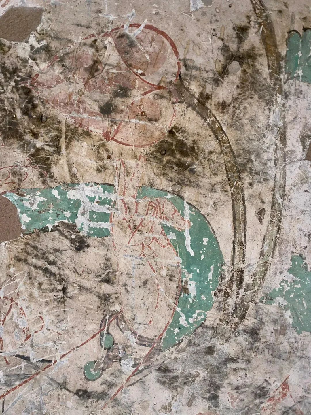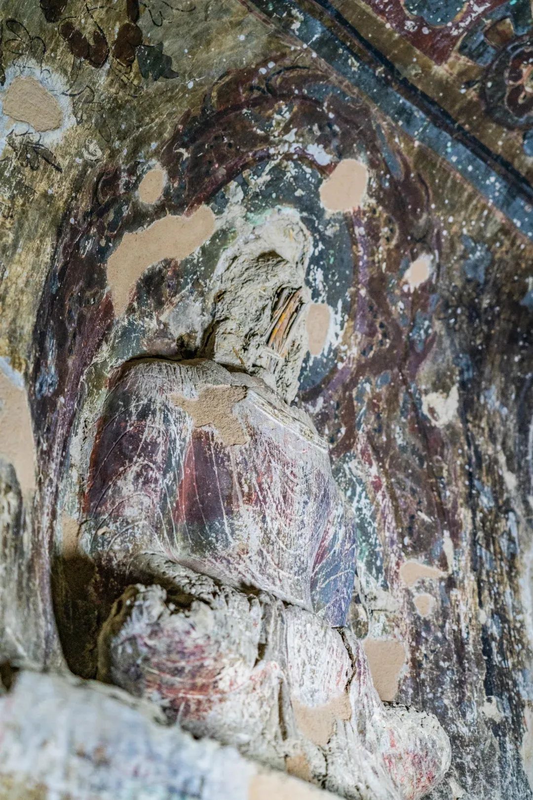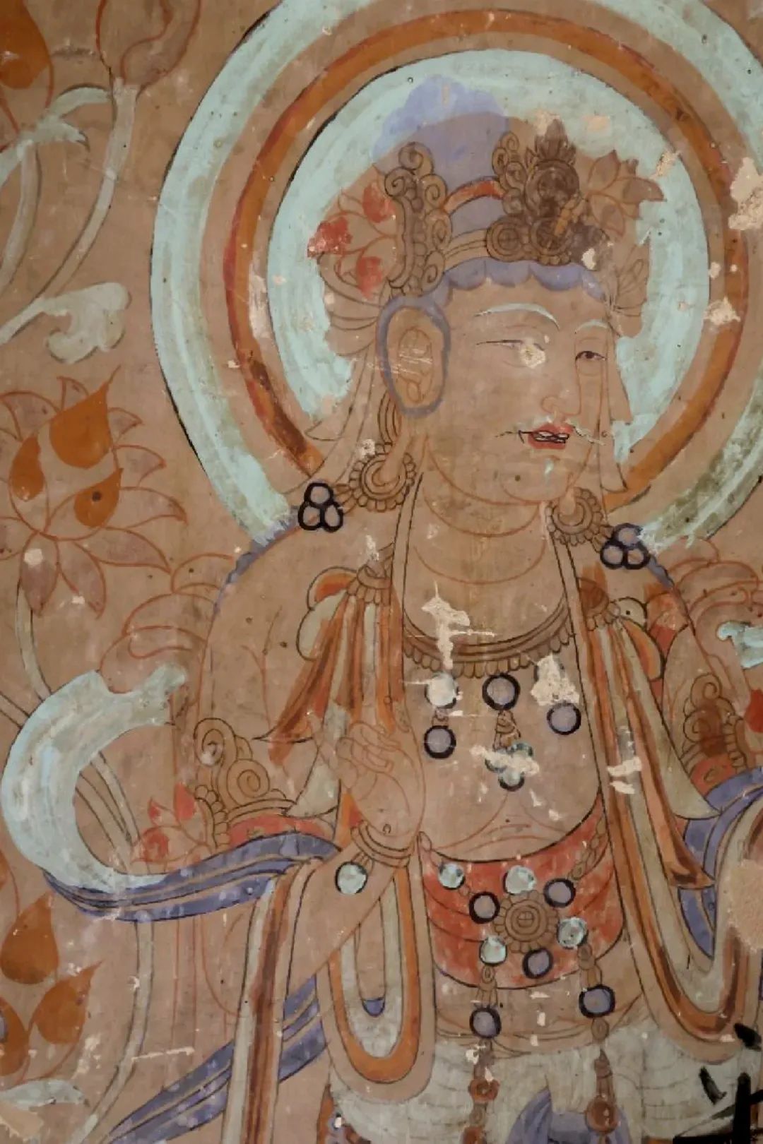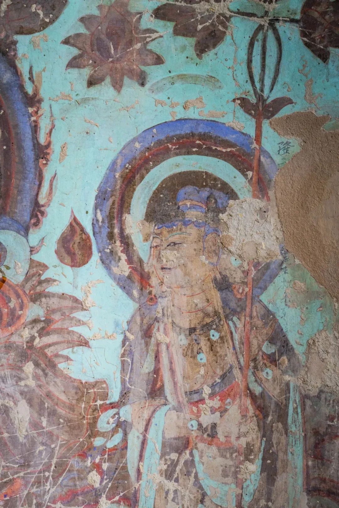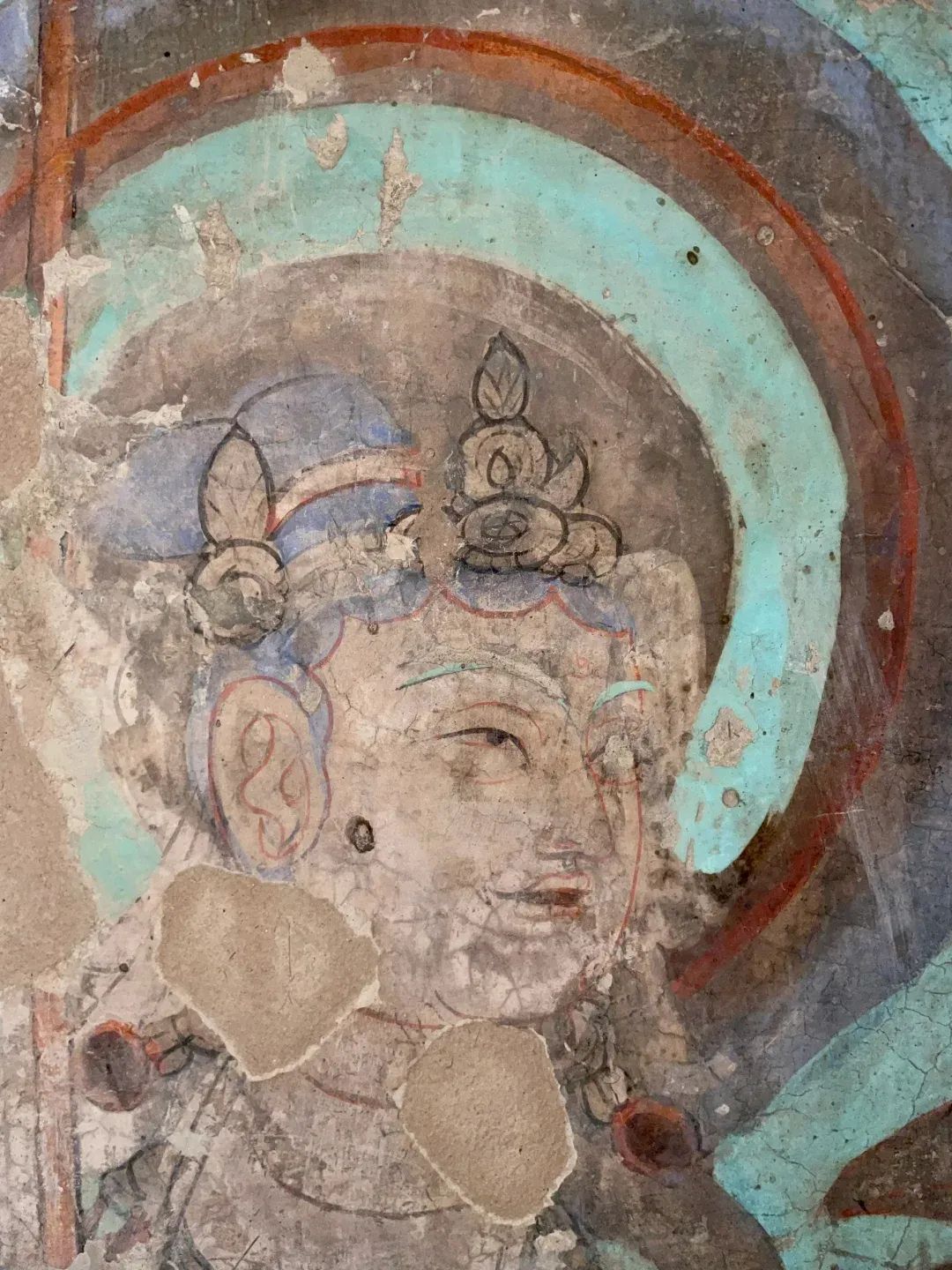 昌馬石窟第4窟洞窟形制及其殘存的塑像對于研究中國早期石窟藝術(shù)與佛教造像藝術(shù)極其重要??邇?nèi)壁畫內(nèi)容是四壁上方畫條式旌幡,下畫供養(yǎng)菩薩,身高近2米,今殘存20身,菩薩周圍畫纏枝蓮,與第二窟基本相同??唔斍鞍氩康卣檀蟛糠置撀?,靠近中心柱正面上部右側(cè)的部位殘存龜形六瓣團花圖案與一身飛天及菊花紋圖案。后部中心柱頂部周圍窟頂表面繪龜形六瓣團花、連珠紋等圖案。