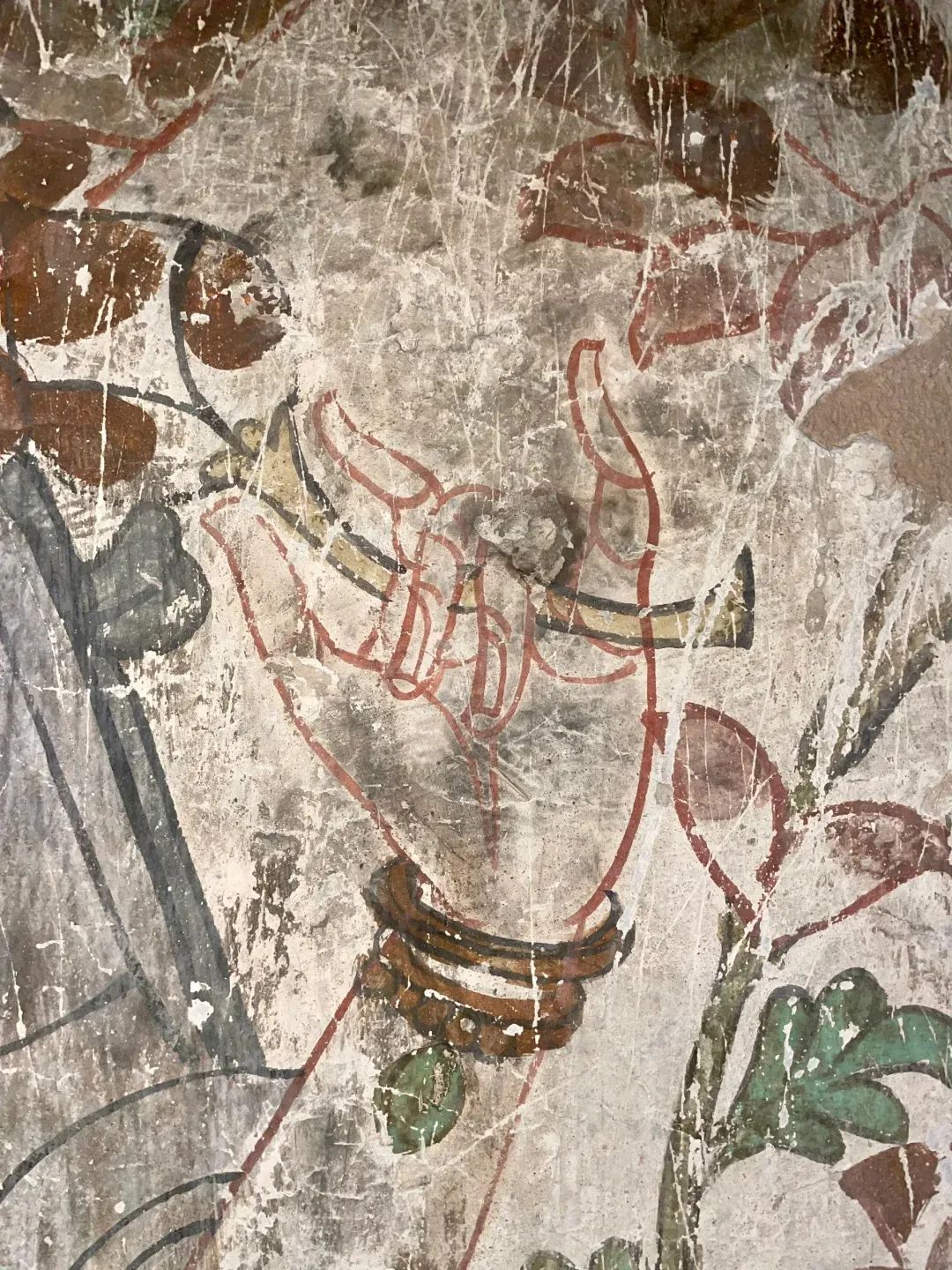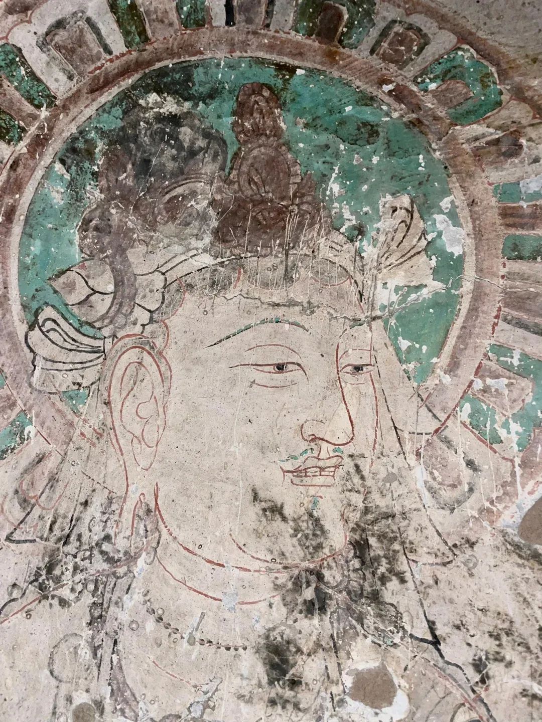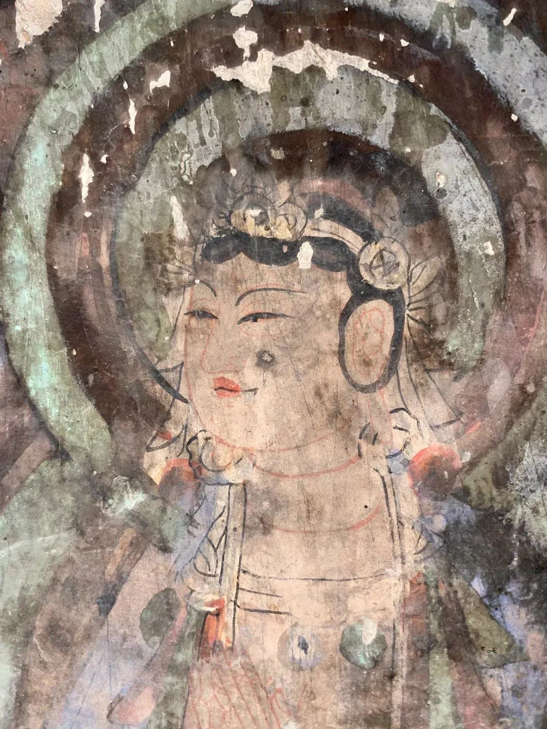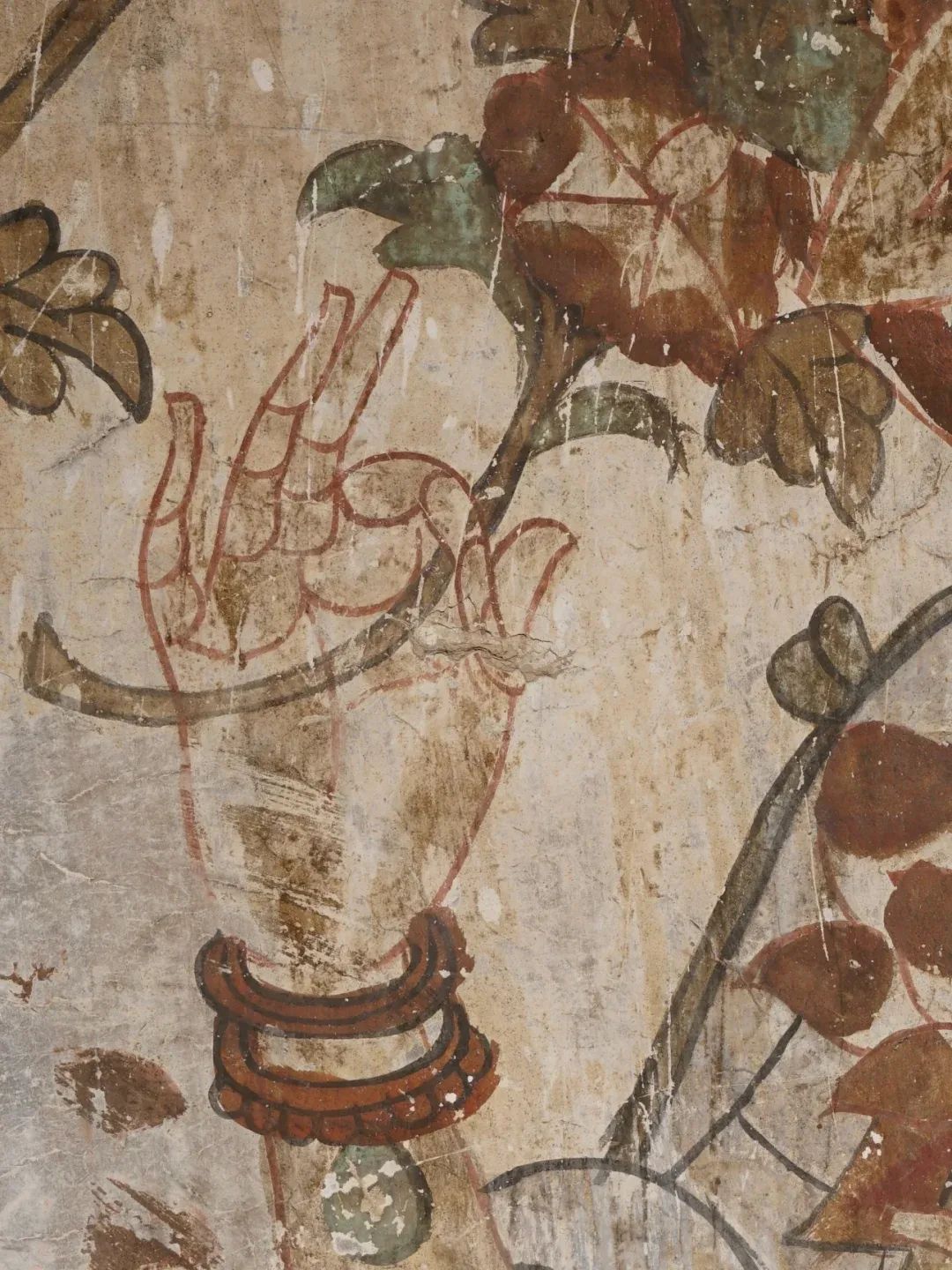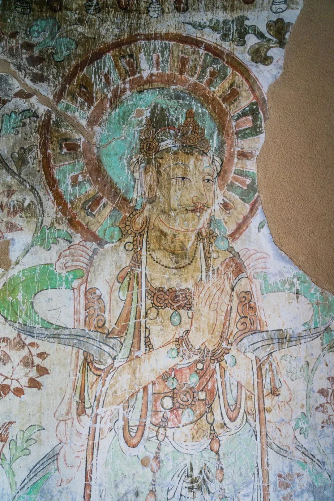 昌馬石窟第4窟洞窟形制及其殘存的塑像對于研究中國早期石窟藝術(shù)與佛教造像藝術(shù)極其重要??邇?nèi)壁畫內(nèi)容是四壁上方畫條式旌幡,下畫供養(yǎng)菩薩,身高近2米,今殘存20身,菩薩周圍畫纏枝蓮,與第二窟基本相同??唔斍鞍氩康卣檀蟛糠置撀?,靠近中心柱正面上部右側(cè)的部位殘存龜形六瓣團花圖案與一身飛天及菊花紋圖案。后部中心柱頂部周圍窟頂表面繪龜形六瓣團花、連珠紋等圖案。