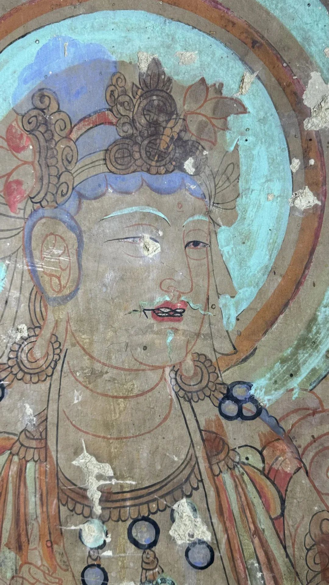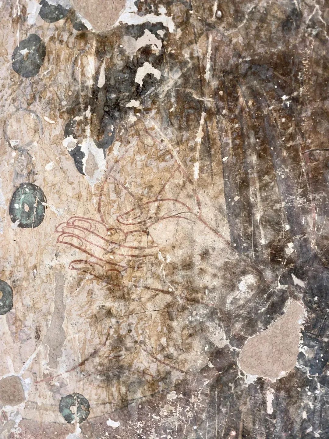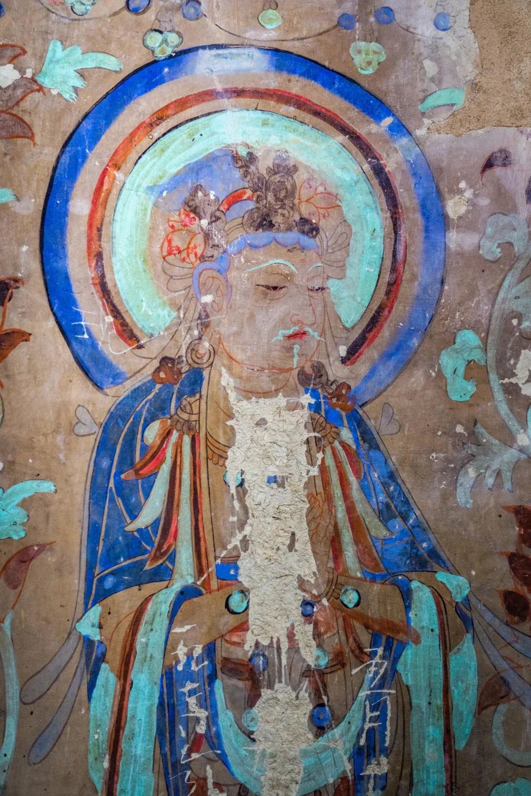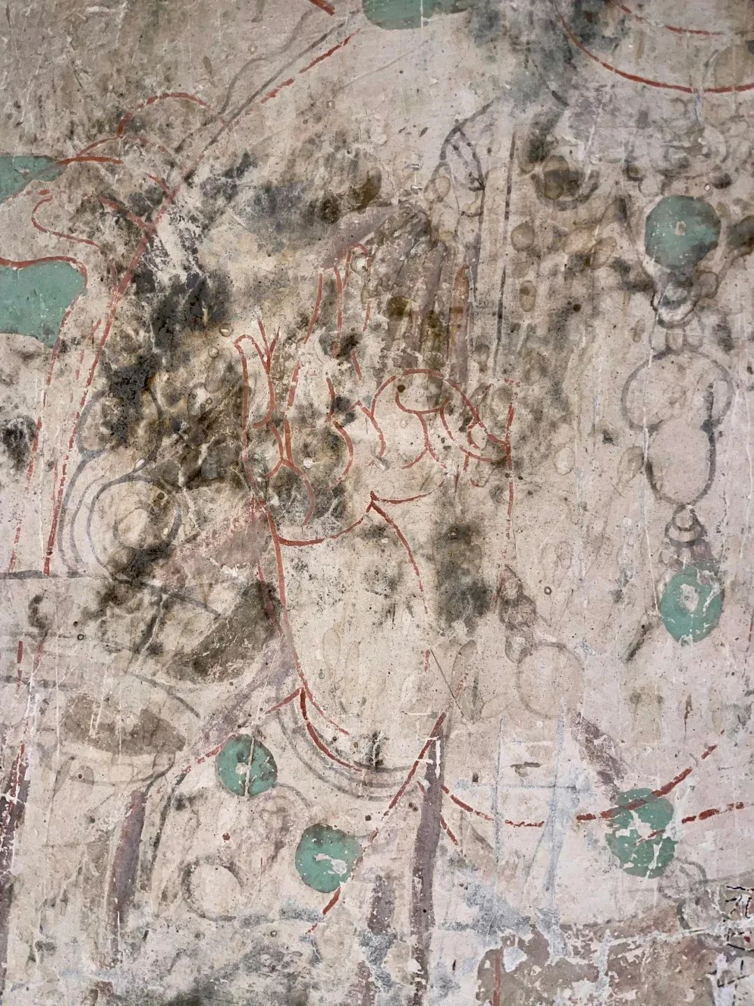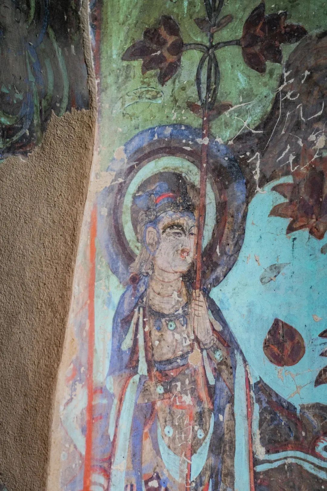 昌馬石窟第4窟洞窟形制及其殘存的塑像對于研究中國早期石窟藝術(shù)與佛教造像藝術(shù)極其重要??邇?nèi)壁畫內(nèi)容是四壁上方畫條式旌幡,下畫供養(yǎng)菩薩,身高近2米,今殘存20身,菩薩周圍畫纏枝蓮,與第二窟基本相同??唔斍鞍氩康卣檀蟛糠置撀?,靠近中心柱正面上部右側(cè)的部位殘存龜形六瓣團花圖案與一身飛天及菊花紋圖案。后部中心柱頂部周圍窟頂表面繪龜形六瓣團花、連珠紋等圖案。
