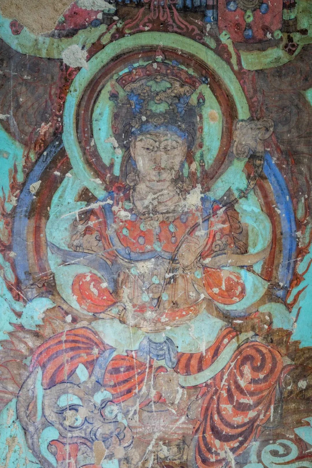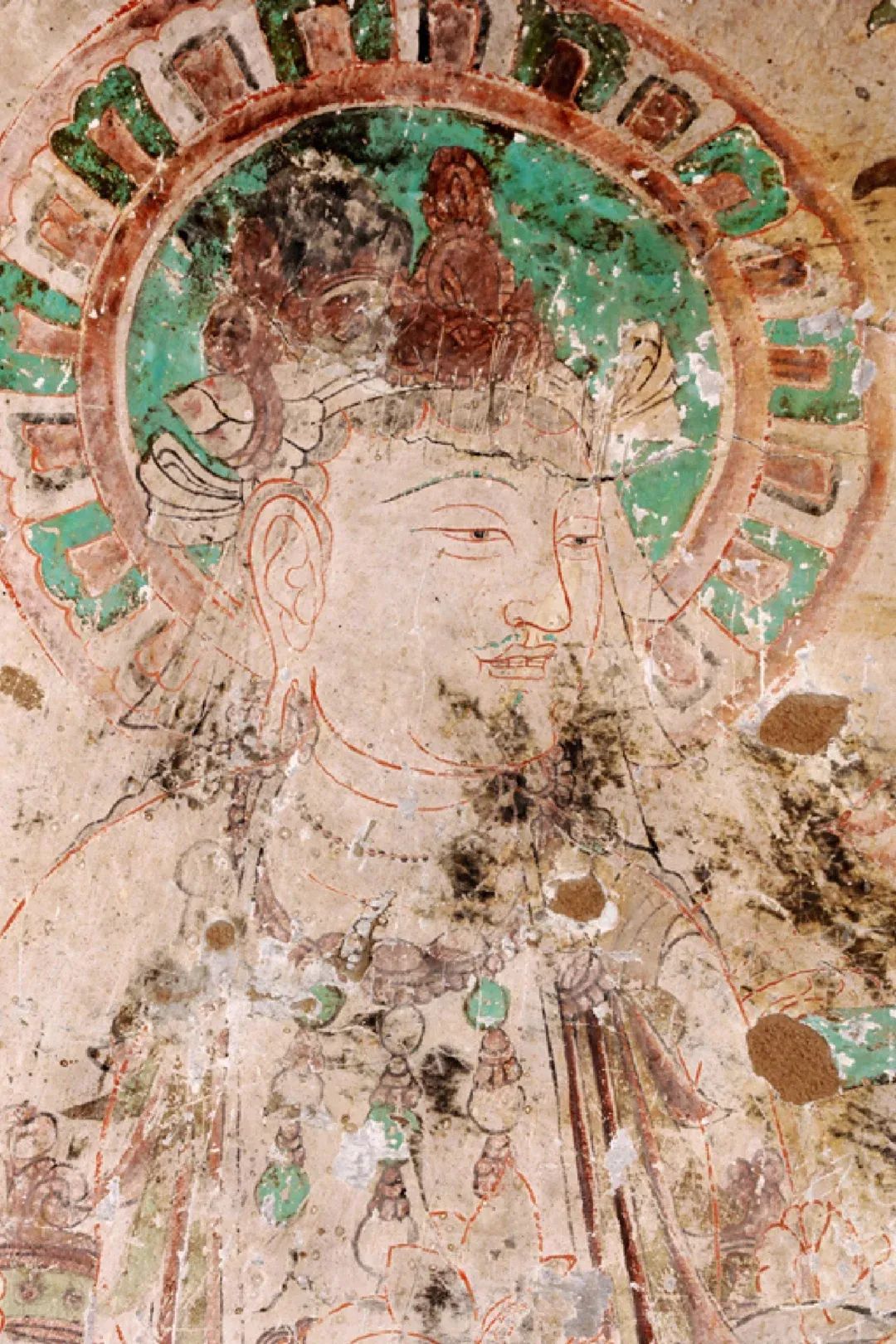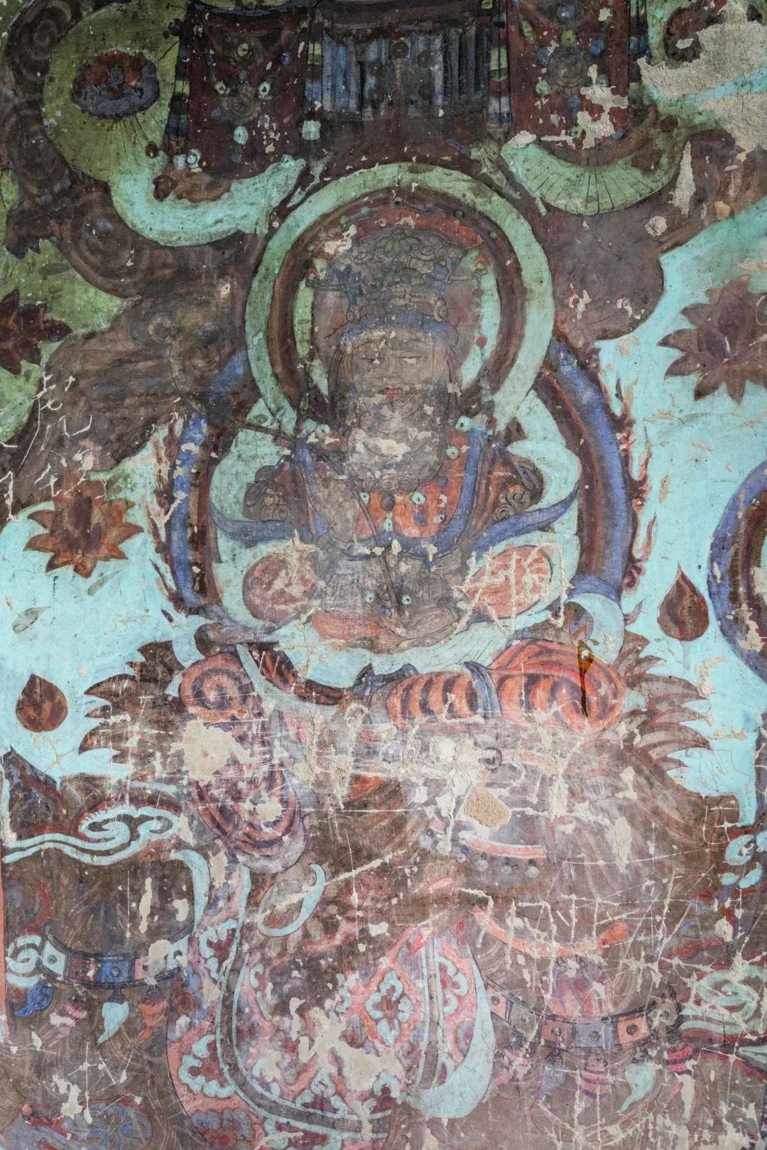 現(xiàn)在第4窟中早期塑像多數(shù)已毀,但仍殘存少數(shù)幾身,十分珍貴;各側(cè)面表層為西夏重修時繪制的壁畫;柱座與柱身的兩層自下而上逐層縮??;中心柱正面在西夏時改造成一橢圓形的大背屏,背屏正面表層為清代重繪的壁畫;四壁及頂上壁畫也多為西夏時期。