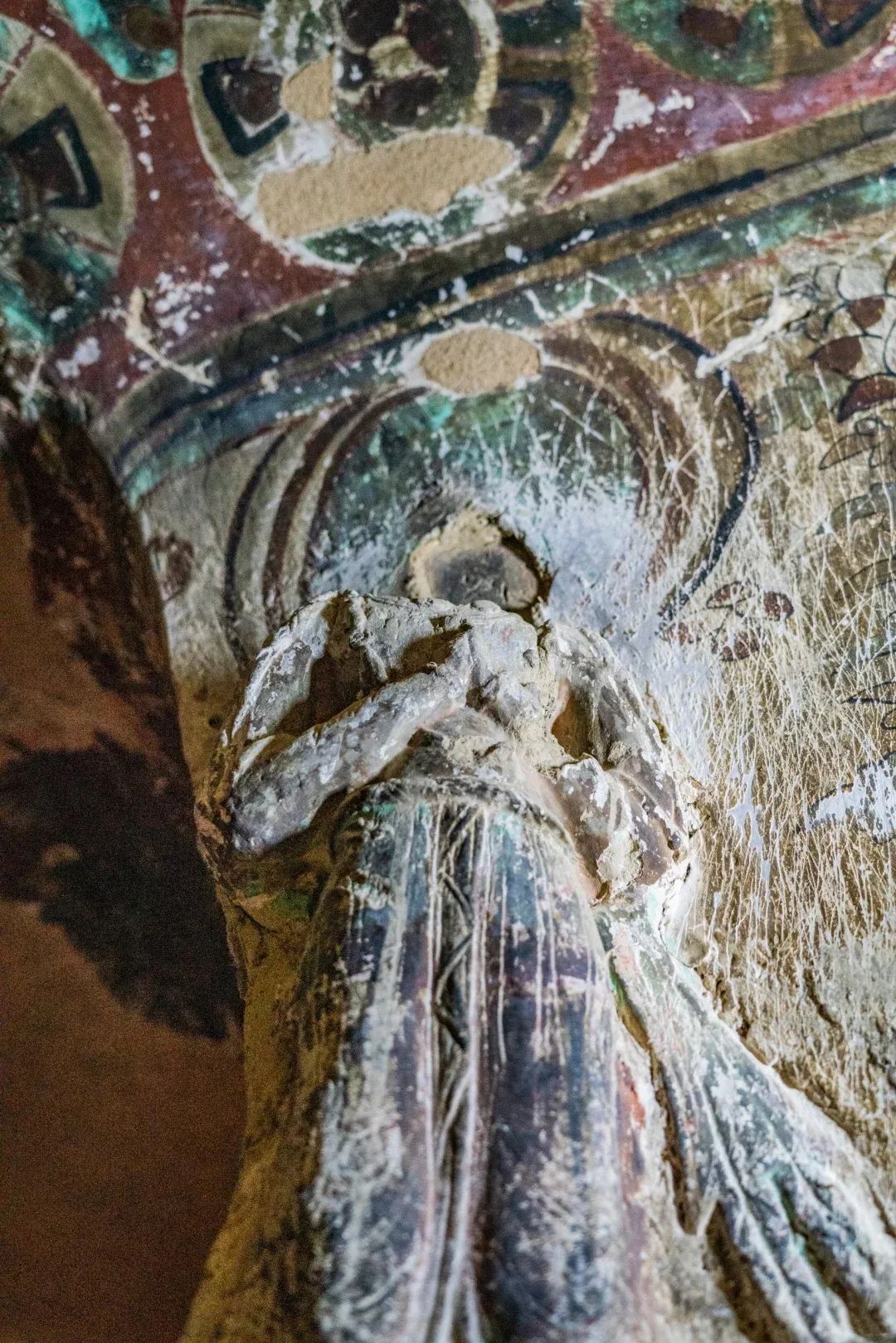 昌馬石窟所在的玉門地區(qū)是古代絲綢之路的必經(jīng)之地,也是佛教東傳的必經(jīng)之地。早期從印度或西域傳來的佛教造像風格在昌馬石窟中也有所反映。第4窟中心柱上層的坐佛塑像采用的在胸前及手臂表面呈連續(xù)相疊的“U”字形下垂的陰線刻衣紋的形式,我們在敦煌莫高窟第259窟與馬蹄寺石窟千佛洞第2窟等處的坐佛塑像身上都可以見到,這種貼體的袈裟表面陰刻規(guī)整衣紋的形式是受到印度笈多造像藝術(shù)影響的產(chǎn)物。