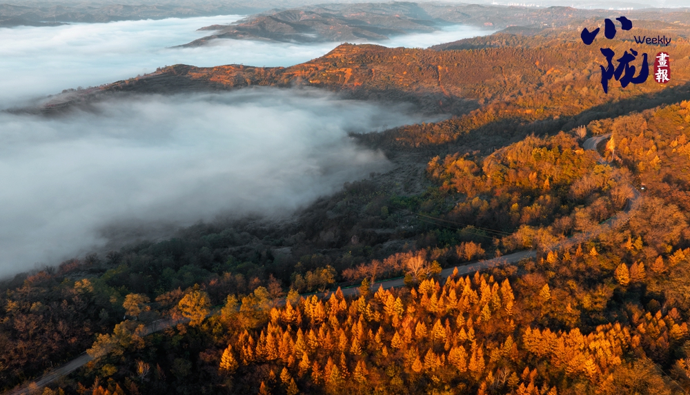 冬日暖陽下,大片的林海層林盡染,金黃、橙紅、橘紅等色彩和云霧交織,五彩繽紛、斑斕如畫。