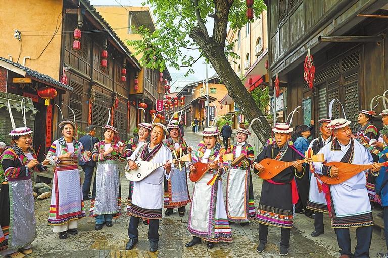 在文縣鐵樓藏族鄉(xiāng)草河壩村白馬山寨,土琵琶彈唱表演吸引游客駐足觀賞。新甘肅·甘肅日?qǐng)?bào)記者 馮樂(lè)凱