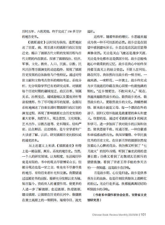 從上述意義上來(lái)講,《鎮(zhèn)原通史》稱(chēng)得上是一部全面、真實(shí)、系統(tǒng)的地方史。當(dāng)然,一個(gè)人的研究領(lǐng)域、認(rèn)知程度、生活閱歷畢竟是有限的,書(shū)中的觀點(diǎn)盡管博采眾長(zhǎng),但部分觀點(diǎn)也是一家之言,難免有不盡善盡美的地方,有待后來(lái)者補(bǔ)充和完善。我期望通過(guò)這部史書(shū)的出版,能夠充分發(fā)揮以史為鏡、知古鑒今、資政育人的重要作用,使更多的人進(jìn)一步了解鎮(zhèn)原、走近鎮(zhèn)原、熱愛(ài)鎮(zhèn)原、建設(shè)鎮(zhèn)原,讓鎮(zhèn)原在歷史的長(zhǎng)河中,像鑲嵌在黃土高原上的一顆明珠,璀璨奪目,流光溢彩。