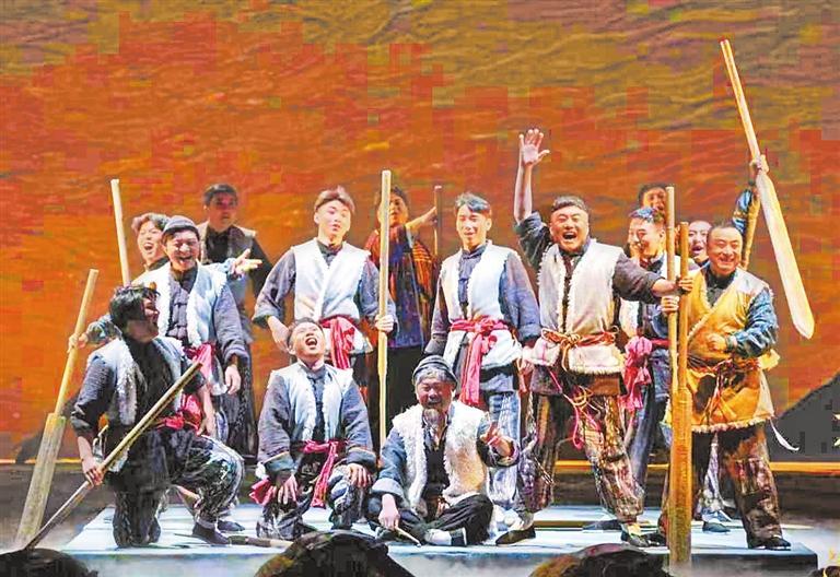 《大河?xùn)|流》的題材構(gòu)成呈現(xiàn)出鮮明的復(fù)合型特征,其核心在于將黃河文化、甘肅地域特色、抗戰(zhàn)歷史與家族倫理熔鑄為一體。劇中,黃河既是地理坐標,更是文化符號。從開場的“黃河號子”到貫穿全劇的羊皮筏子,從金城關(guān)、黃河鐵橋的舞臺化呈現(xiàn)到地游子步、風(fēng)擺柳等隴劇特有的身段程式,黃河的自然景觀與人文精神被轉(zhuǎn)化為舞臺符號。