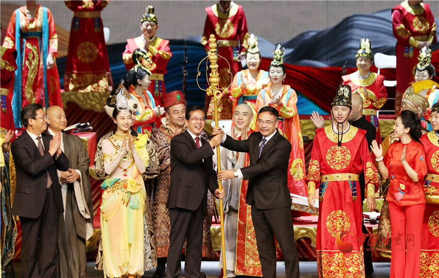 《玄奘西行》作為世界首部大型民族器樂劇,以絲綢之路文化交流使者玄奘的歷史故事為題材,集多民族樂器演奏和戲劇表演為一體,集中展示了敦煌莫高窟壁畫復(fù)原古樂器及古絲綢之路各民族傳統(tǒng)音樂的美妙旋律,體現(xiàn)了當(dāng)代民族音樂的繼承與創(chuàng)新精神,是我國(guó)民族器樂舞臺(tái)藝術(shù)的高峰之作。演出結(jié)束后,中央民族樂團(tuán)向甘肅省文藝院團(tuán)捐贈(zèng)舞美道具,并指導(dǎo)幫助甘肅省文藝院團(tuán)實(shí)現(xiàn)《玄奘西行》的常態(tài)化駐場(chǎng)演出,為甘肅省再添一張靚麗的文藝名片。