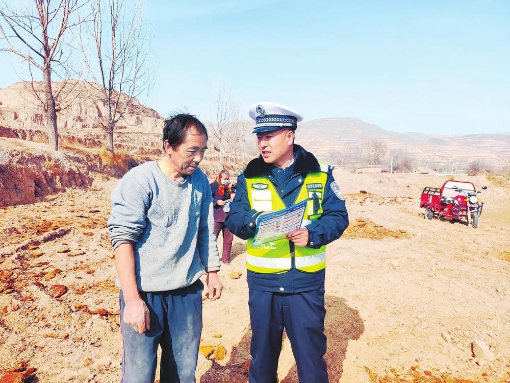 民警向群眾講解法律法規(guī)。3月10日,隴西縣公安局渭陽(yáng)派出所民警深入田間地頭,開展道路交通安全和反電詐宣傳?! ⌒赂拭C·甘肅法治報(bào)通訊員劉榮攝