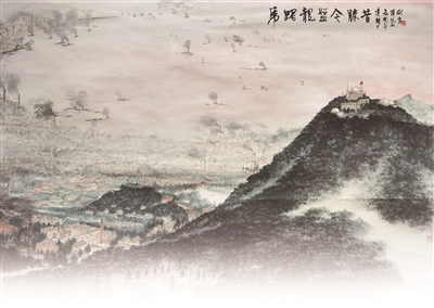 1949年4月23日,人民解放軍占領(lǐng)南京。毛澤東聞?dòng)嵑?,欣然寫下這首詩,描寫了人民解放軍橫渡長(zhǎng)江、解放南京的雄偉壯闊、氣勢(shì)磅礴場(chǎng)面。在畫作中,畫家描繪的是南京城的壯麗景色,沐浴在朝暉之中的紫金山及其周圍景致,以浪漫的詩意呈現(xiàn)出來。近處,紫金山巍峨高聳,天文臺(tái)亦清晰可見;中景,江上輪渡往來,兩岸工廠林立,煙霧繚繞;遠(yuǎn)處,紅霞爛漫,水天一色。新中國(guó)成立后的南京繁忙而祥和,墨色淋漓間,新中國(guó)欣欣向榮的景象躍然紙上。