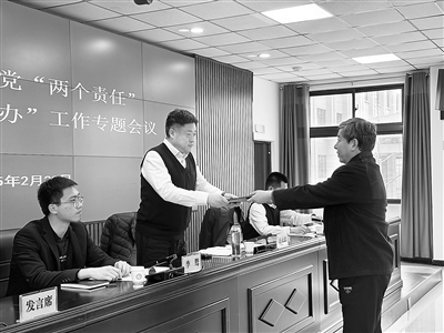 圖為河南省安陽市紀(jì)委監(jiān)委向派駐市水利局紀(jì)檢監(jiān)察組遞交2025年度全面從嚴(yán)治黨監(jiān)督責(zé)任清單,持續(xù)推動“兩個責(zé)任”走深走實。王小山 攝