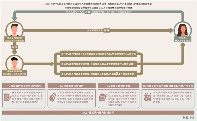 貪污罪。2017年10月,林某某妻子陶某某(無業(yè),另案處理)考慮到自己以個(gè)人身份繳納社保已滿15年,而按照規(guī)定,個(gè)人參保在55歲才能領(lǐng)取養(yǎng)老金,于是便想掛靠企業(yè)單位參保,以便能在50歲辦理退休、提前享受退休待遇?;诖?,陶某某便與林某某商量能否掛靠B縣農(nóng)業(yè)開發(fā)公司提前辦理退休,林某某聽后表示同意,并利用擔(dān)任該公司董事長(zhǎng)的職務(wù)便利,在明知陶某某不符合提前退休條件的情況下,安排時(shí)任公司辦公室主任李某某(另案處理)虛構(gòu)勞動(dòng)關(guān)系,為陶某某以該公司職工身份辦理退休事宜。手續(xù)辦理過程中,李某某按林某某的安排,偽造B縣農(nóng)業(yè)開發(fā)公司與陶某某的《勞動(dòng)合同書》,經(jīng)林某某本人簽字后加蓋公司合同專用章,陶某某憑該合同在B縣人力資源和社會(huì)保障局進(jìn)行勞動(dòng)合同鑒證。完成鑒證后,陶某某順利以B縣農(nóng)業(yè)開發(fā)公司職工身份參保,當(dāng)年度公司為其繳納職工養(yǎng)老保險(xiǎn)、工傷保險(xiǎn)、失業(yè)保險(xiǎn)、醫(yī)療保險(xiǎn)共計(jì)7649.76元。其間,陶某某從未在B縣農(nóng)業(yè)開發(fā)公司上班,也未向公司補(bǔ)繳為其繳納的社保費(fèi)用。