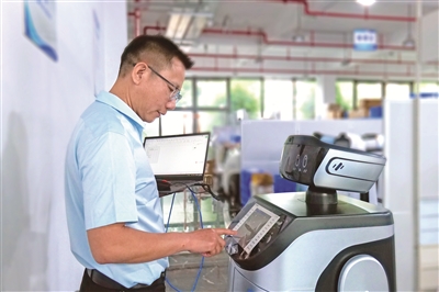 福建省福州市,服務機器人應用技術(shù)員謝茂皇正在對機器人產(chǎn)品的功能進行調(diào)試。周磊 攝