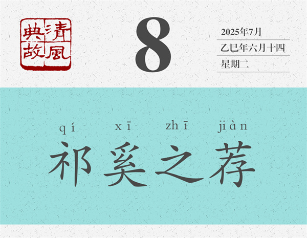 左丘明認(rèn)為,祁奚才是真正能舉薦賢能的人:“稱其仇,不為諂;立其子,不為比;舉其偏,不為黨。”意思是,祁奚推舉他的仇人,不是為了諂媚;推薦自己的兒子,不是出于偏愛(ài);推薦自己的下屬,不是為了結(jié)黨營(yíng)私?!秴问洗呵铩贩Q:“外舉不避仇,內(nèi)舉不避子,祁黃羊可謂公矣。”后世即以“祁奚之薦”為典,形容舉薦人才心胸開(kāi)闊,公正無(wú)私。唐人姚元崇《答張九齡書》:“歷官三朝,年逾一紀(jì),凡所稱薦,罕避嫌疑,實(shí)有祁奚之舉。”