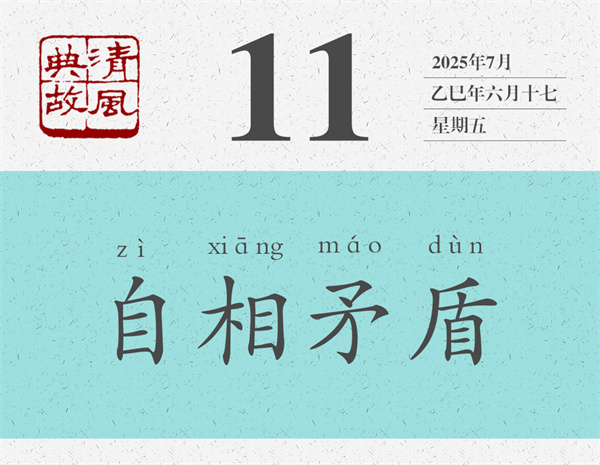 “自相矛盾”的本義是,不管是自己的矛刺穿了自己的盾,還是自己的盾無(wú)法被自己的矛刺穿,都會(huì)陷入不能自圓其說的難堪境地。后人則以“自相矛盾”為典,比喻一個(gè)人前面說的和后面說的、前面做的和后面做的相互抵觸,或者自己所說與所做、自己所為與所述互相沖突。也指同一機(jī)關(guān)、同一機(jī)構(gòu)中各個(gè)部門、各個(gè)成員之間說法不統(tǒng)一,行為不一致。宋人王觀國(guó)《學(xué)林·言行》:“圣賢言行,要當(dāng)顧踐,毋使自相矛盾。”