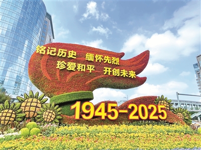 圖為紀(jì)念中國(guó)人民抗日戰(zhàn)爭(zhēng)暨世界反法西斯戰(zhàn)爭(zhēng)勝利80周年主題花壇。