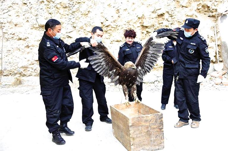 截至3月1日,經(jīng)過管護(hù)站管護(hù)人員的精心喂養(yǎng),金雕進(jìn)食進(jìn)水已經(jīng)正常,身體恢復(fù)了健康,具備野外生存能力、符合放生的條件,最終放歸大自然。金雕屬鷹科、真雕屬的猛禽,是國家一級(jí)保護(hù)動(dòng)物,以其敏捷有力地飛行而著稱,以大中型的鳥類和獸類為食。