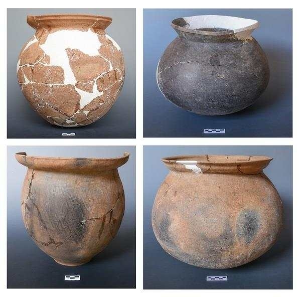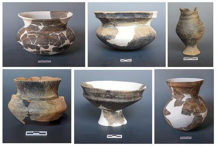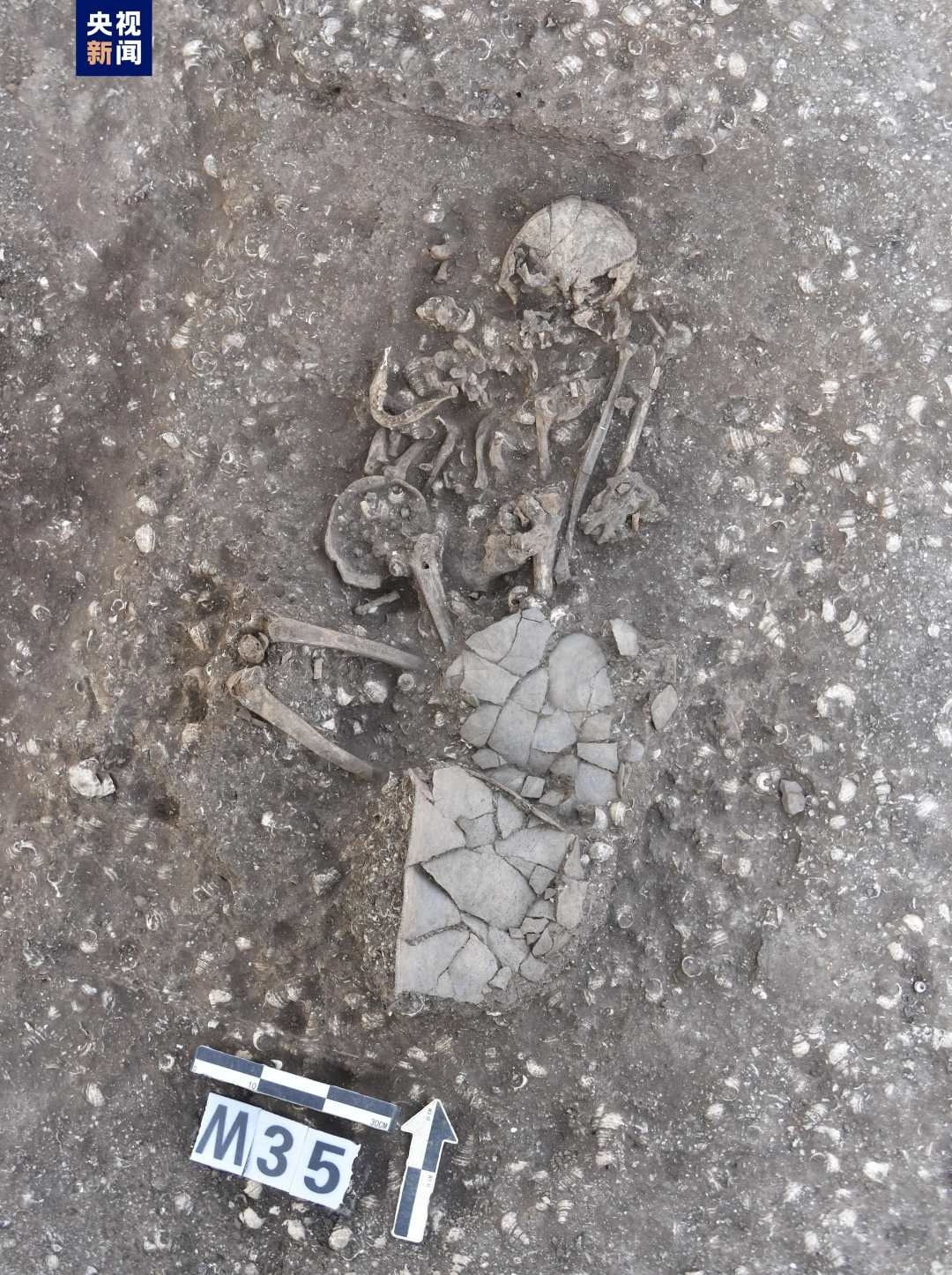 古城村遺址面積約4.2萬平方米,現(xiàn)存的貝丘堆積最厚處達6.5米,由大量尾部被敲破的螺螄殼與灰土層交替堆疊形成。碳十四測定年代為距今3600至2500年,約相當(dāng)于中原地區(qū)的商代至兩周時期。商代遺存可分為早晚兩段,早段發(fā)現(xiàn)保存完整的橢圓形環(huán)壕聚落,由中心臺地、外圍環(huán)壕和護坡組成,中心臺地面積約27000平方米,環(huán)壕和護坡周長約600米,這種聚落格局一直延續(xù)至兩周時期。商代晚段發(fā)現(xiàn)一批土坑墓和甕棺葬。兩周時期的遺存以房址、螺殼堆、灰燼、活動面等居住類遺跡為主,房址多為方形半地穴式。出土青銅器、陶器、玉器、石器、骨器、木器等文物4000余件。