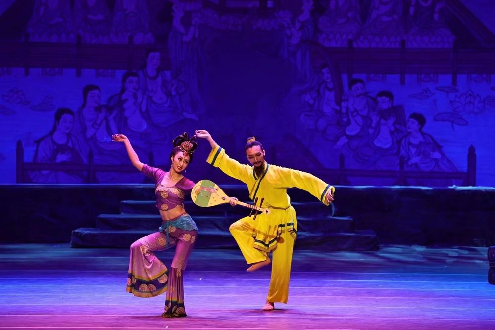 2023年1月26日,演員康琦(左一)在國家大劇院表演舞劇《絲路花雨》(甘肅省歌舞劇院供圖)