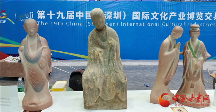 在甘肅主題館,來自天水的石窟雕塑作者何彥云帶著麥積山石窟133窟北魏小沙彌的仿真雕塑參展深圳文博會。還有石窟雕塑畫家董瑞軍,帶著麥積山石窟44窟西魏文皇后雕塑臨摹畫參展。這兩件雕塑有一個共同特點——“來自東方的微笑”,后者更被譽為“東方的蒙娜麗莎”。