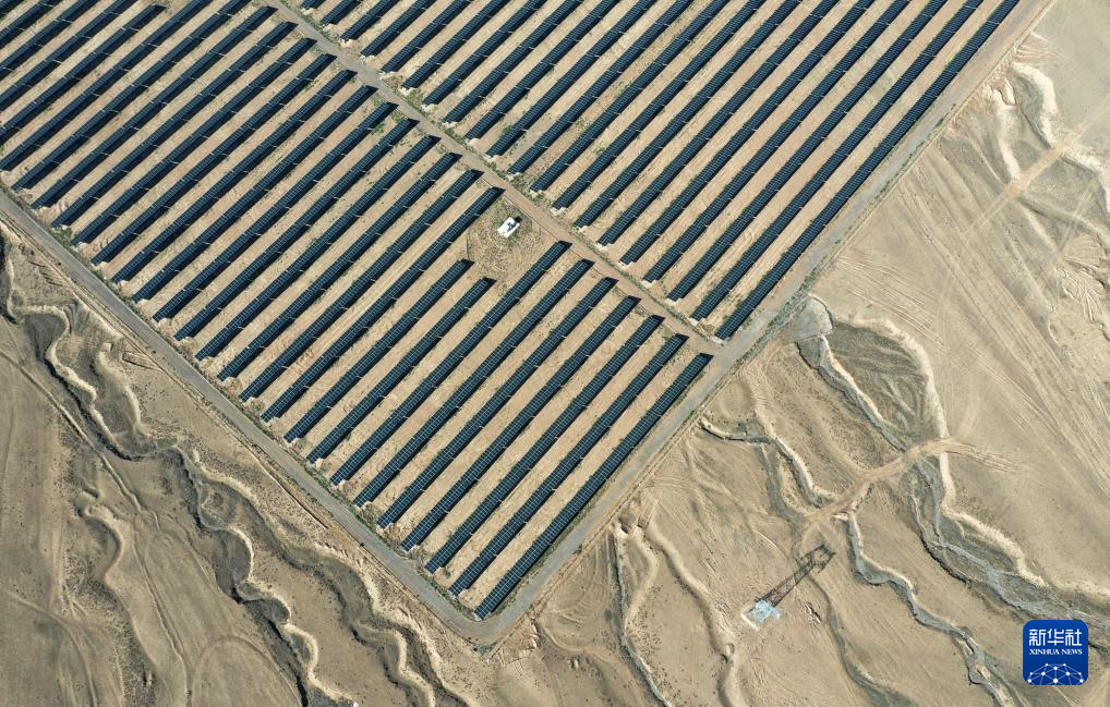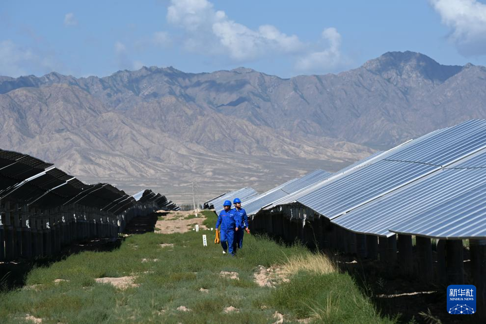 8月11日,工作人員在中國(guó)能建張掖甘州南灘30萬千瓦光伏發(fā)電項(xiàng)目巡檢。新華社記者 金良快 攝