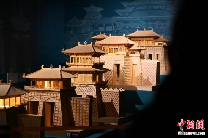 《千年?duì)I造——敦煌壁畫中的建筑之美》特展上的古代建筑模型。該模型的“單門道花磚城門”來源于莫高窟第159窟。李亞龍 攝