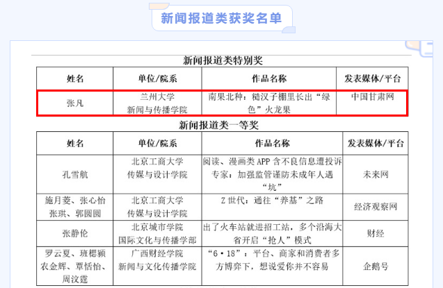 蘭州大學新聞與傳播學院獲獎中,張凡的作品《南果北種!糙漢子棚里種出“綠色”火龍果》在中國甘肅網刊發(fā),系蘭州大學新聞與傳播學院、中國甘肅網聯(lián)合舉辦的第十三屆“重走中國西北角”接力采訪活動新聞作品。