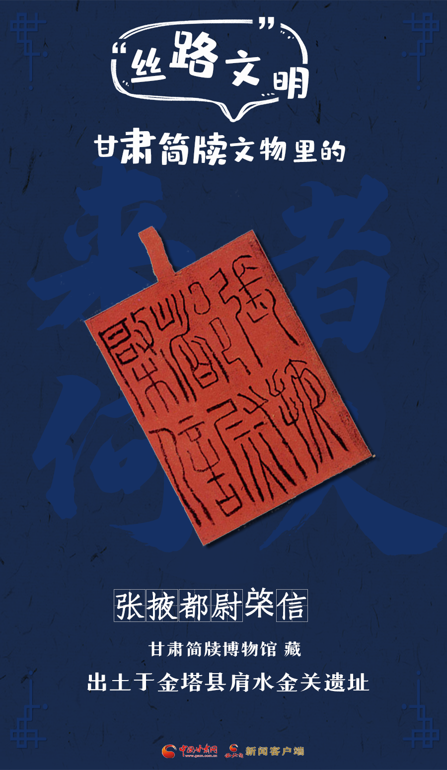 上方綴系,墨筆篆書“張掖都尉棨信”六字。文字簡明,應屬于幡信之類