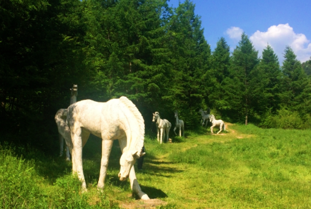 在碧草連天的谷地,當?shù)芈糜尾块T擺放了一組白馬的大型雕塑,栩栩如生,它們要么仰天長嘶,要么低首撫弄地上的青草,還有的彼此耳鬢廝磨,像是親密的戀人。