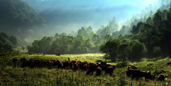 同樣是在天水市的張家川,關山,那列人文印痕飽滿的山脈像一條綠絲帶在我們面前展現(xiàn)著無盡的美麗,只是在張家川境內(nèi),它的旋律卻像是被擰緊的琴弦發(fā)出的,凝結(jié),突兀,而在相鄰的陜西省隴縣,它才盡情地展示著牧場的魅力,每一處峰巒山頂上還是一片林子,到了山腰卻變成了美麗的草甸,遍布牛馬。