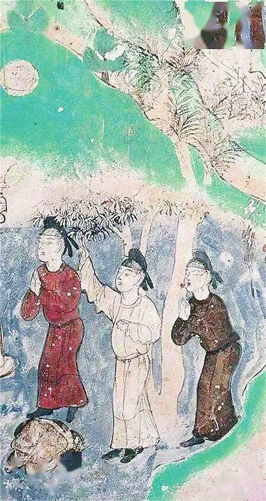 我想,這也是古代敦煌女子在中秋拜月時最真摯的愿望:覓得佳偶、擇得良婿;家庭和睦、永不分離!值得注意的是在敦煌有關(guān)相戀男女主題壁畫中總是表現(xiàn)出“有情人必成眷屬”的信念。如在莫高窟第321窟壁畫中有一幅“青年男女圖”、在莫高窟第85窟壁畫中有一幅“樹下彈箏圖”、在榆林窟第38窟壁畫中有一幅“同入青廬圖”等。這些壁畫有著很多相似之處:一是畫面中的男女多穿情侶衫。女性或上衣或下裙總有一個和男性的袍服使用的顏色相同;二是畫面中的情感都是大團圓的美滿結(jié)局;三是畫面中男女的情緒都被刻繪得欣喜若狂、堅定執(zhí)著。我想當年這些表達中秋意象的畫匠們一定是為了不辜負這澄澈圓滿的明月吧!