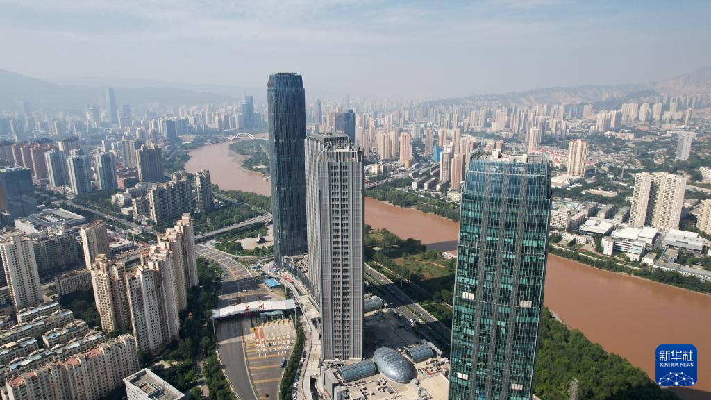 這是蘭州市城關(guān)區(qū)黃河岸邊林立的高樓(9月24日攝,無人機(jī)照片)。新華社記者陳斌攝