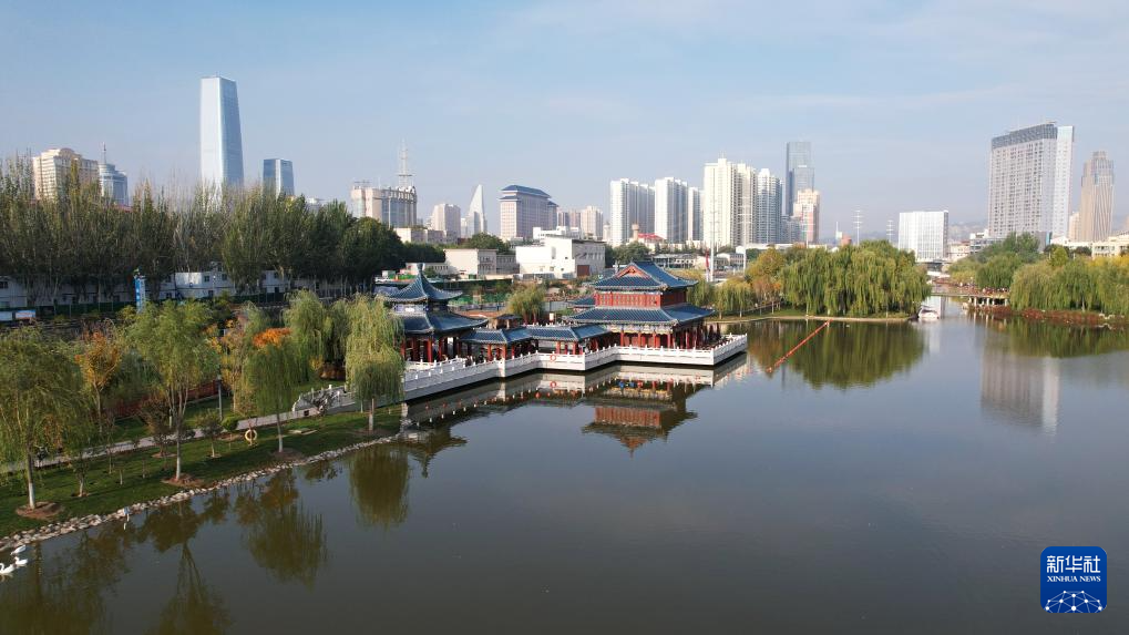 這是位于蘭州市城關(guān)區(qū)黃河岸邊的雁灘公園(10月17日攝,無人機(jī)照片)。新華社記者陳斌攝