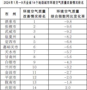 2024年1月—9月,全省14個(gè)地級(jí)城市環(huán)境空氣質(zhì)量改善情況排名由好到差分別為:酒泉市、張掖市、武威市、臨夏州、定西市、嘉峪關(guān)市、天水市、甘南州、白銀市、蘭州市、金昌市、平?jīng)鍪小㈦]南市、慶陽市。