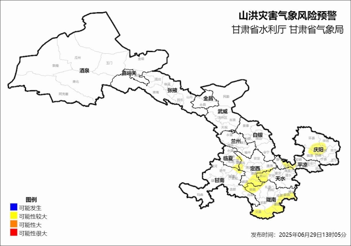 根據(jù)省氣象局《重大氣象信息專報(bào)》(2025年甘氣第10期),未來十天甘肅省多降水天氣,具有對流性強(qiáng)、小時雨強(qiáng)大、累積雨量大等特點(diǎn),洪水災(zāi)害風(fēng)險(xiǎn)高。6月29日13時,省水利廳、省氣象局聯(lián)合發(fā)布山洪災(zāi)害氣象風(fēng)險(xiǎn)預(yù)警:預(yù)計(jì),6月29日14時至30日14時,白銀市(景泰縣),武威市(古浪縣),定西市(臨洮縣、渭源縣、通渭縣、隴西縣、漳縣、岷縣),臨夏州(廣河縣、東鄉(xiāng)縣、康樂縣),甘南州(臨潭縣、卓尼縣、舟曲縣、迭部縣),天水市(秦安縣、甘谷縣、武山縣、張家川縣),隴南市(宕縣、禮縣、武都區(qū)、成縣、文縣、康縣、徽縣、兩當(dāng)縣),平?jīng)鍪校o寧縣、崆峒區(qū)、華亭市、莊浪縣),慶陽市(西峰區(qū)、慶城縣、環(huán)縣、華池縣、鎮(zhèn)原縣)等地區(qū)發(fā)生山洪災(zāi)害可能性較大(黃色預(yù)警)。