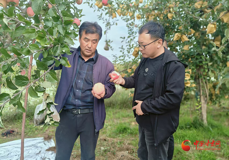 圖為果農(nóng)杜效斌和李建國(guó)研究果品 朱強(qiáng)/攝