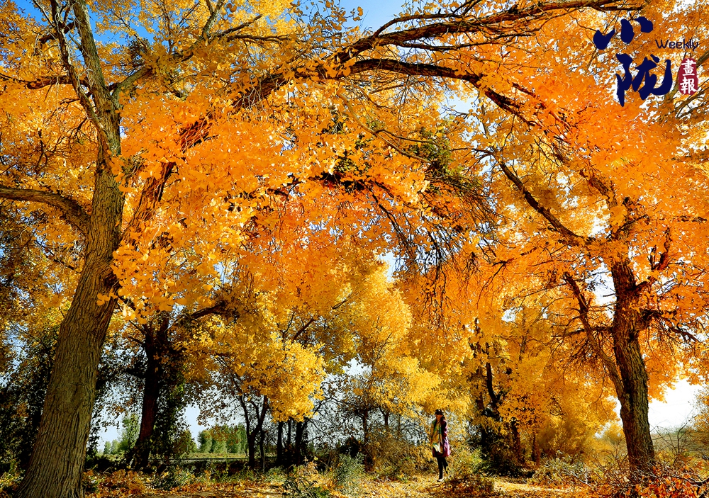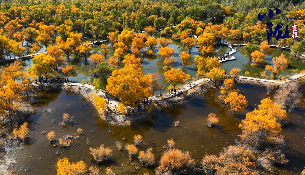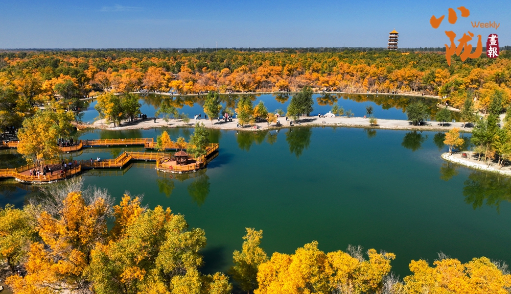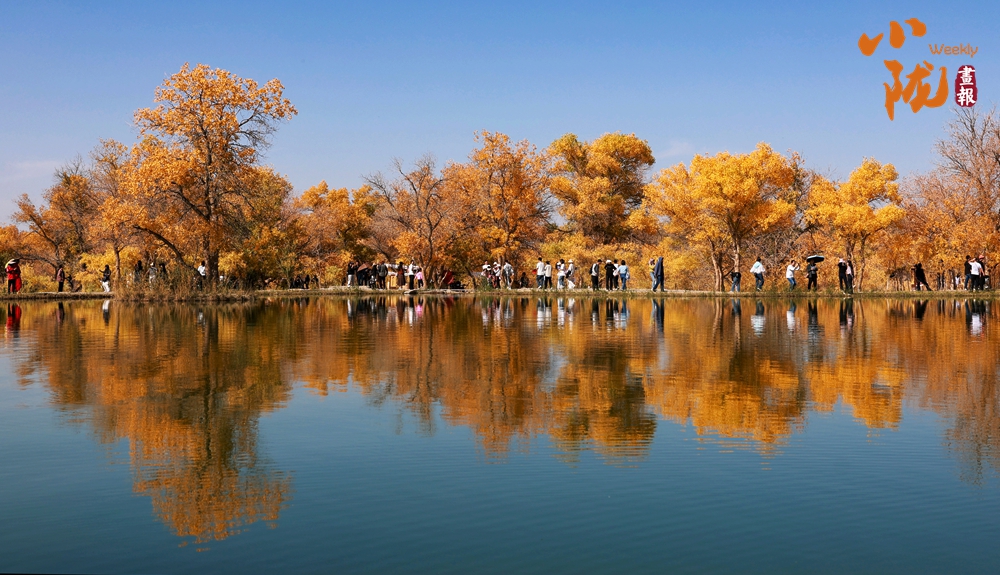 胡楊茂盛,疊翠流金,裊裊身姿倒影湖中。風一吹,樹梢輕顫,成千上萬片葉子像被點燃的火焰,在藍得沒有一絲雜質(zhì)的天空下翻涌、跳躍,充滿詩意。林間小道上,游客悠閑漫步,盡享美好時光。